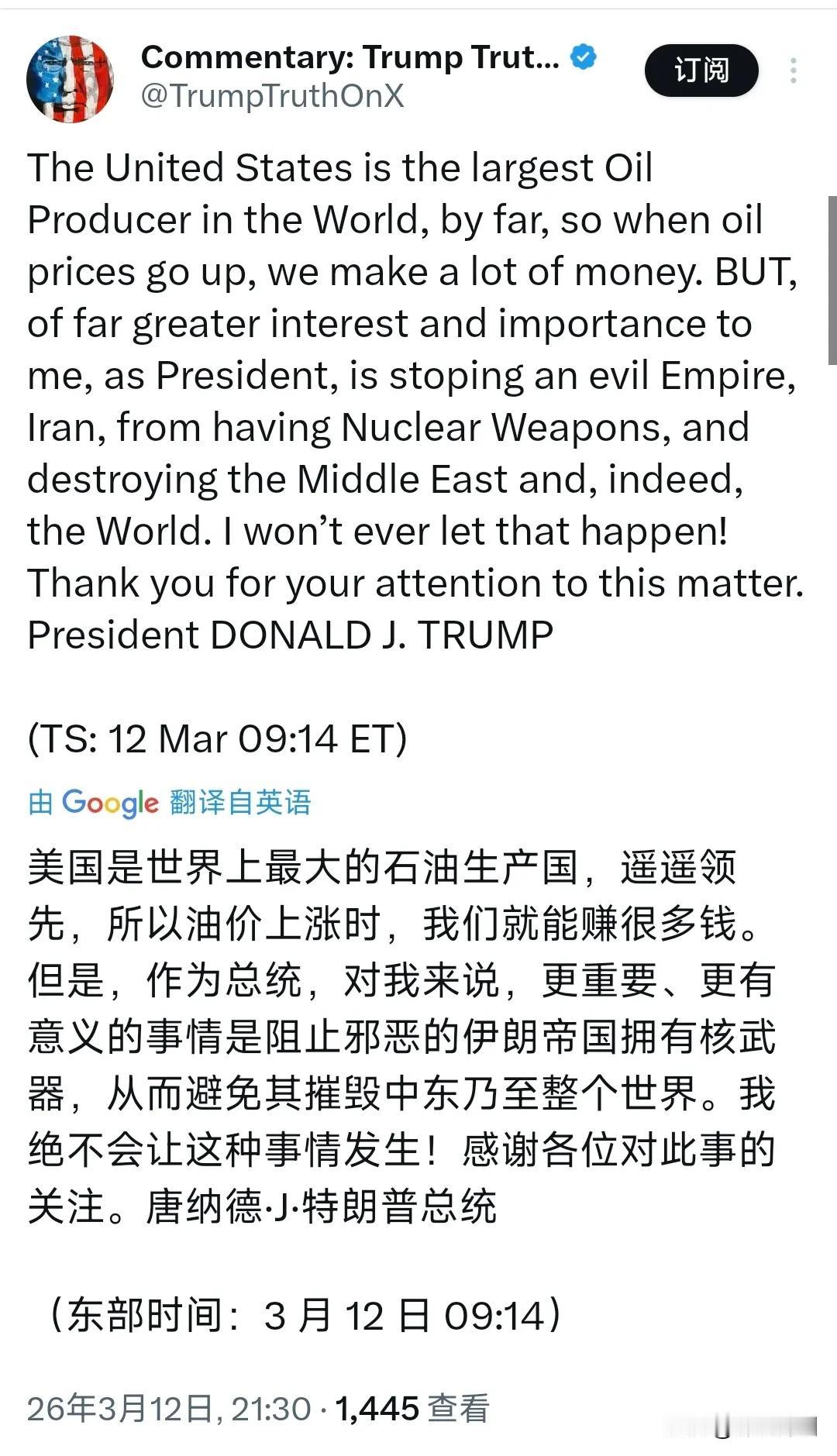 特朗普今晚(北京时间3月12日)发文写道:“美国是世界上最大的石油生产国,遥遥领先,所以油价上涨时,我们就能赚很多钱。但是,作为总统,对我来说,更重要,更有意义的事情是阻止邪恶的伊朗帝国拥有核武器,从而避免其摧毁中东乃至整个世界。我绝不会让这种事情发生!” 评几句: 特朗普此番言论,将美国石油利益与对伊核政策捆绑,尽显实用主义外交与单边霸权逻辑。他以“全球最大产油国”自居,坦然将油价上涨视为获利机会,暴露出美国在能源议题上的利己本质,国际能源市场稳定与否,仅服务于其经济收益。 将阻止伊朗拥核包装为“维护世界安全”,实则是维护美国在中东的主导权。美国长期以“核威胁”为借口对伊施压,却回避自身退出伊核协议、激化地区矛盾的责任。这种将地缘博弈包装成正义之举的叙事,忽视了中东国家的安全诉求,加剧地区对抗风险。 言论背后,是美国利益至上的外交底色:能源收益要赚,地区霸权要守,却无视国际规则与地区和平。单边施压与武力威慑绝非解决核问题的出路,唯有回归对话协商,才能真正维护中东与全球安全。