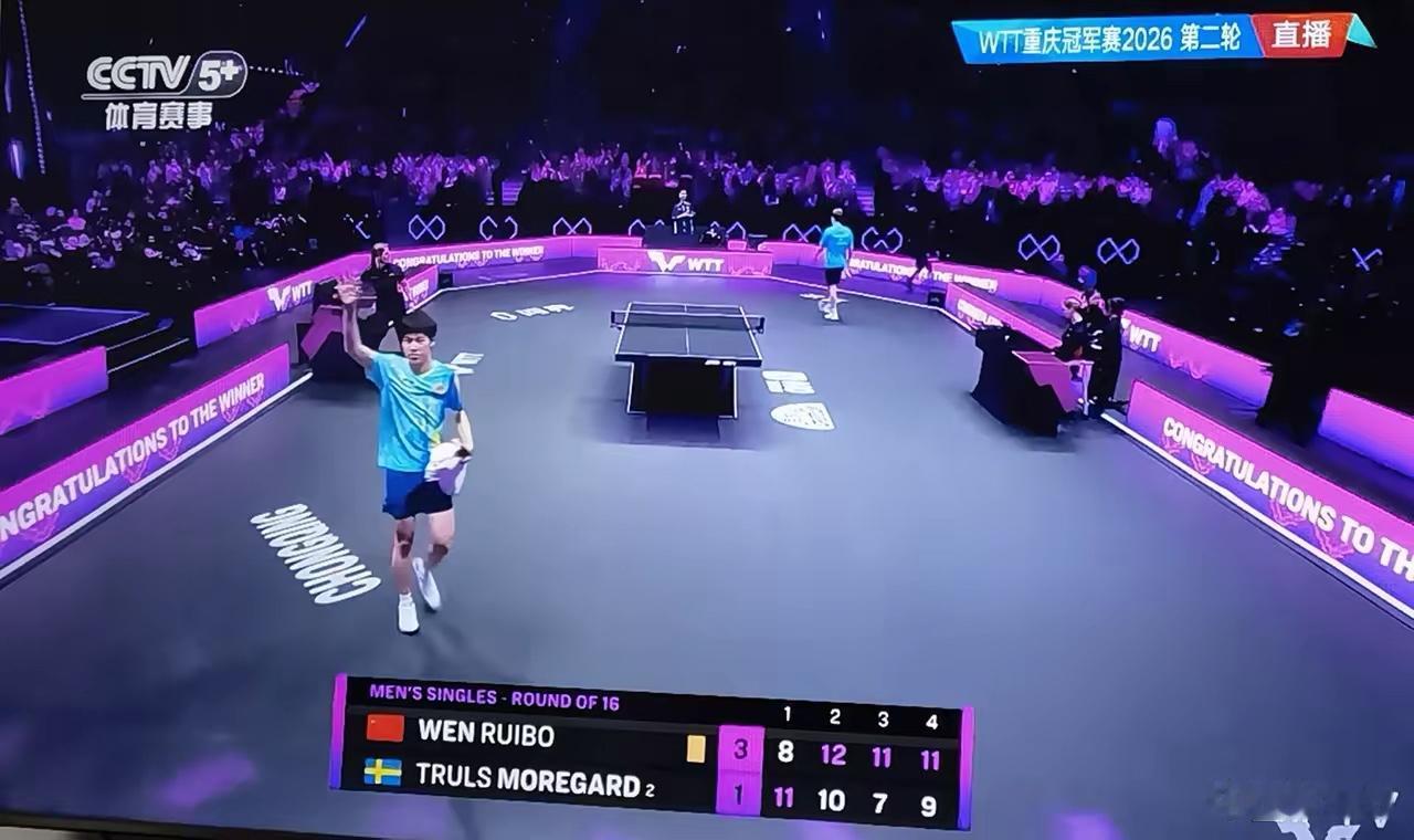 全场沸腾! 国家队的小将温瑞博竟然在W TT重庆冠军赛男单八分之一决赛中战胜了排名世界第二的奥运亚军莫雷加德! 这场比赛在昨天傍晚举行,比赛的第一局,莫雷加德赢了,我就进厨房做晚饭了,客厅的电视机开着,偶尔能听到客厅电视的声音关注赛况,后来开始炒菜,就听不到客厅里电视的声音了,等我炒好一个菜出来,电视屏幕上已经开始播放广告了,显然,温瑞博与莫雷加德的对决已经结束了。 当时我的想法是:这么快就结束了比赛,这瑞博也输得太快了吧? 后来到了晚上空闲下来刷抖音,抖音上都是温瑞博战胜莫雷加德时的沸腾场面,我也被深深地震撼了:温瑞博这19岁的小将真是太厉害了,简直是创造了奇迹,未来可期,祝贺他!
