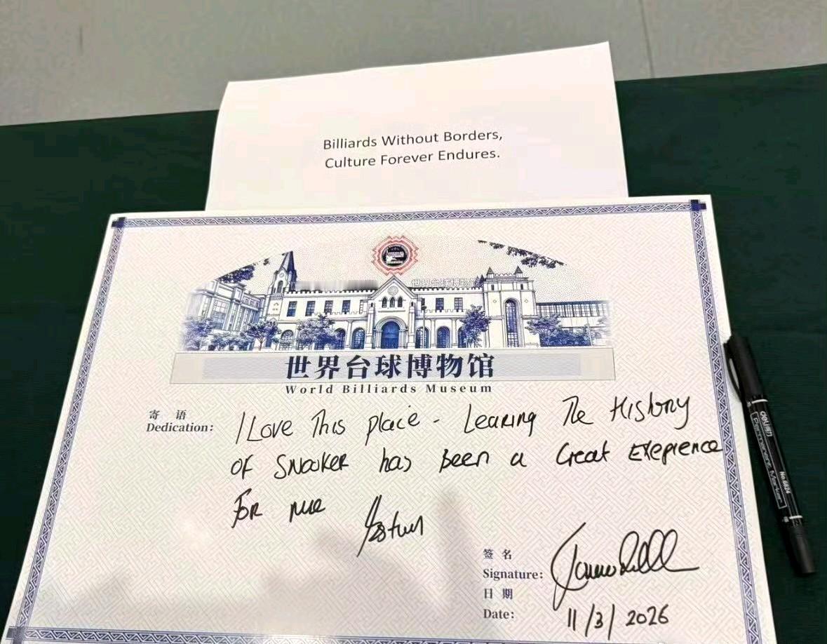 看来奥沙利文这么早来玉山也不完全是为了商业活动。塞大师霍金斯都退赛了,他不但没退,而且坚持每天苦练技术,看来火箭有想法啊,火箭有想法真的是球迷们的福音。 如果火箭资格赛过关,正赛对手已退赛,等于打一场比赛就可以晋级32强。 每天苦练之余,火箭抽空还去参观了玉山的台球博物馆,并且留下了签名,不过他的字是真难看。