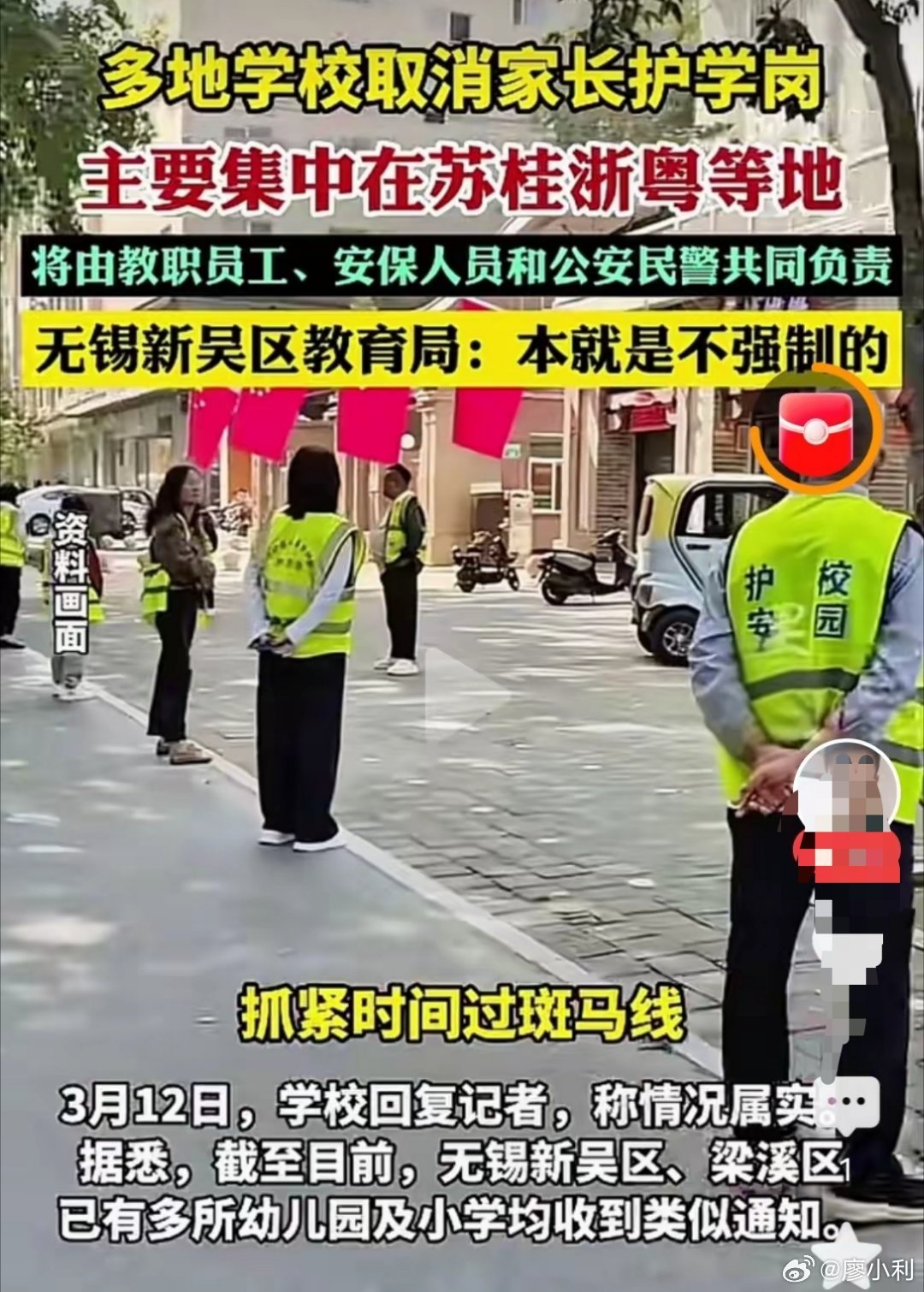 多地学校取消家长护学岗支持取消护学岗!我一直对护学岗的作用存在怀疑,说真的,万一真遇到坏人歹徒,这些手无寸铁的护学岗家长(有些还是爷爷奶奶)真能保护孩子吗?从法律角度讲,学校的安全责任,真没权力让家长来扛。按规定,中小学该配备专职安保人员,门口得有交警疏导交通,这些都是财政投入该覆盖的。
