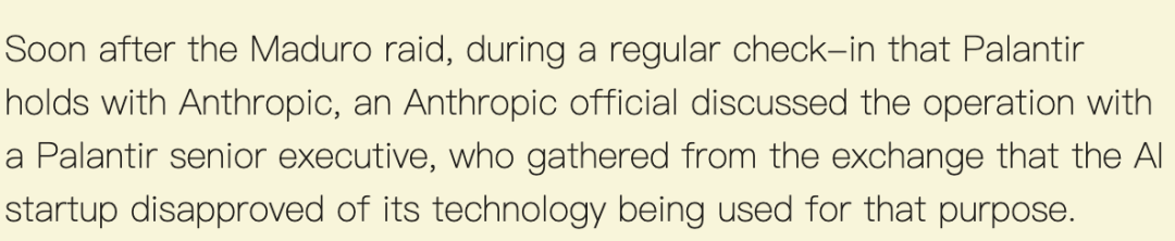 行动结束一段时间后,媒体披露:Anthropic一名高管主动联系了Palantir的相关人员,想详细了解Claude在这次行动中究竟是如何被使用的。