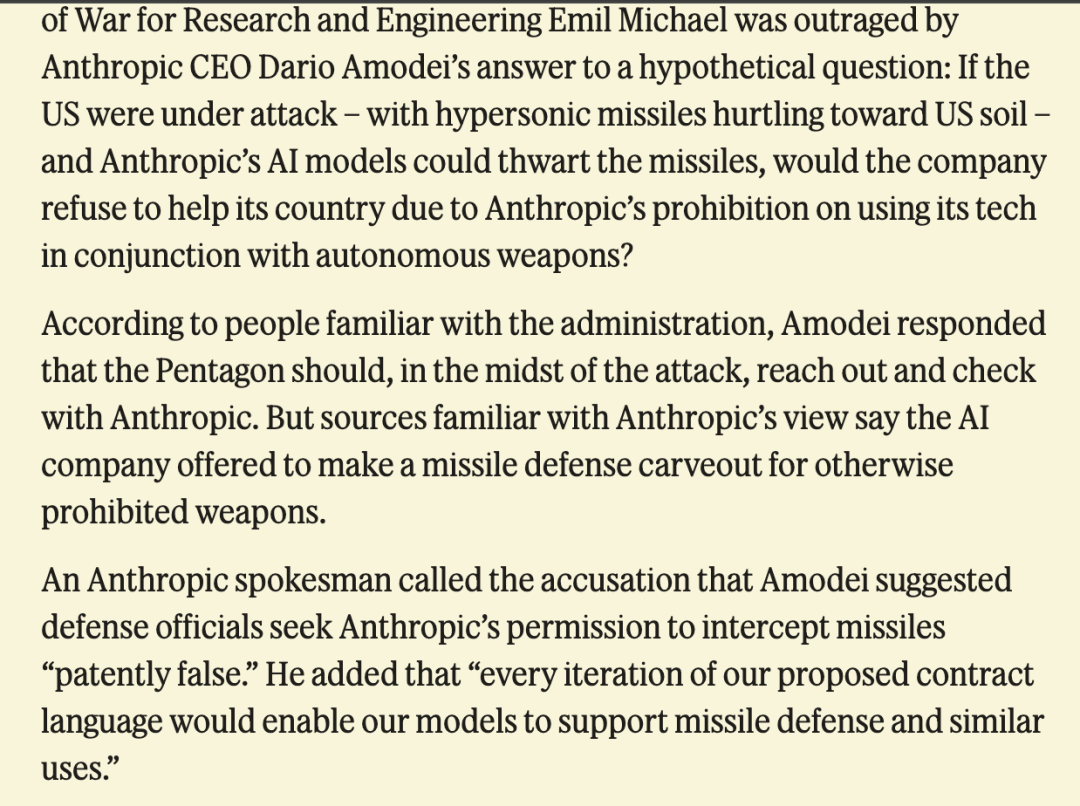 至于自主武器,在过去与五角大楼的合作中,Anthropic本身就认同美国的新一代导弹防御系统「金穹计划」。所以,他认为Anthropic所作所为不过是在洗白自己!