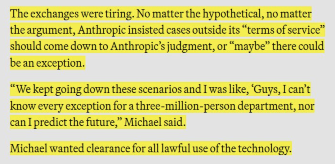 谈判中,Michael花了大量时间向Anthropic解释战争部最基本的运作方式,以及逐一推演各种战争场景。