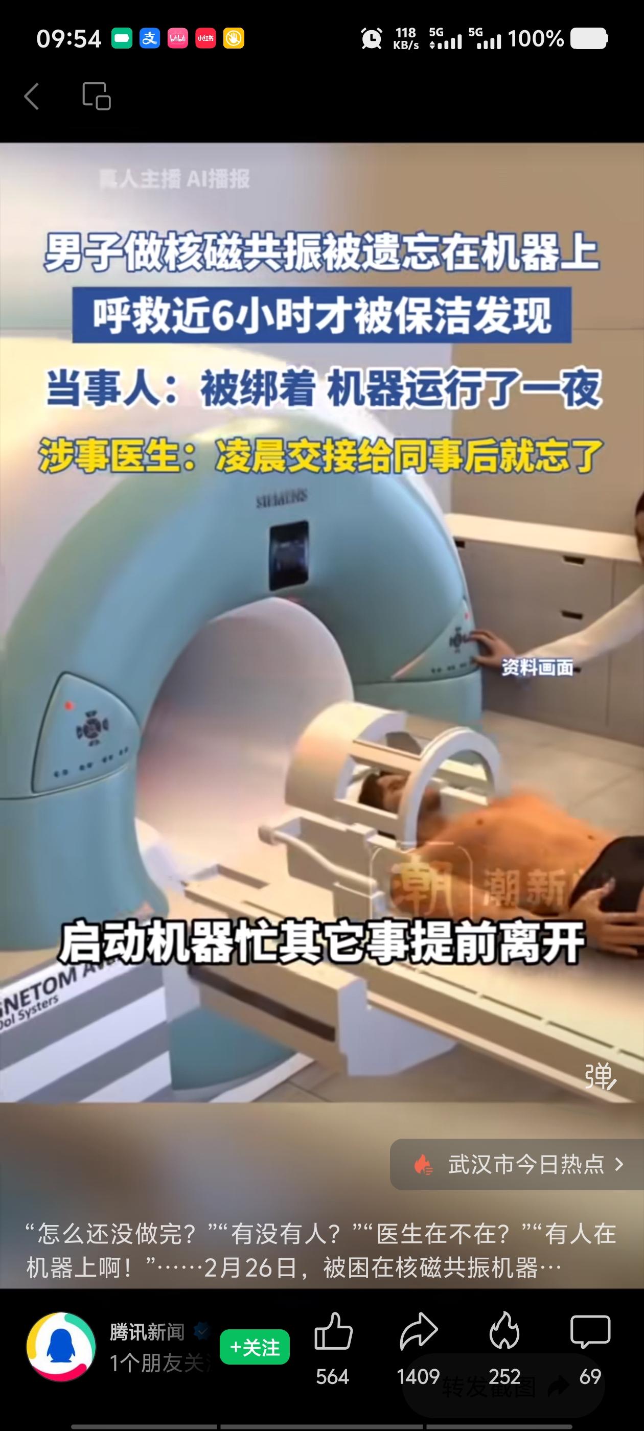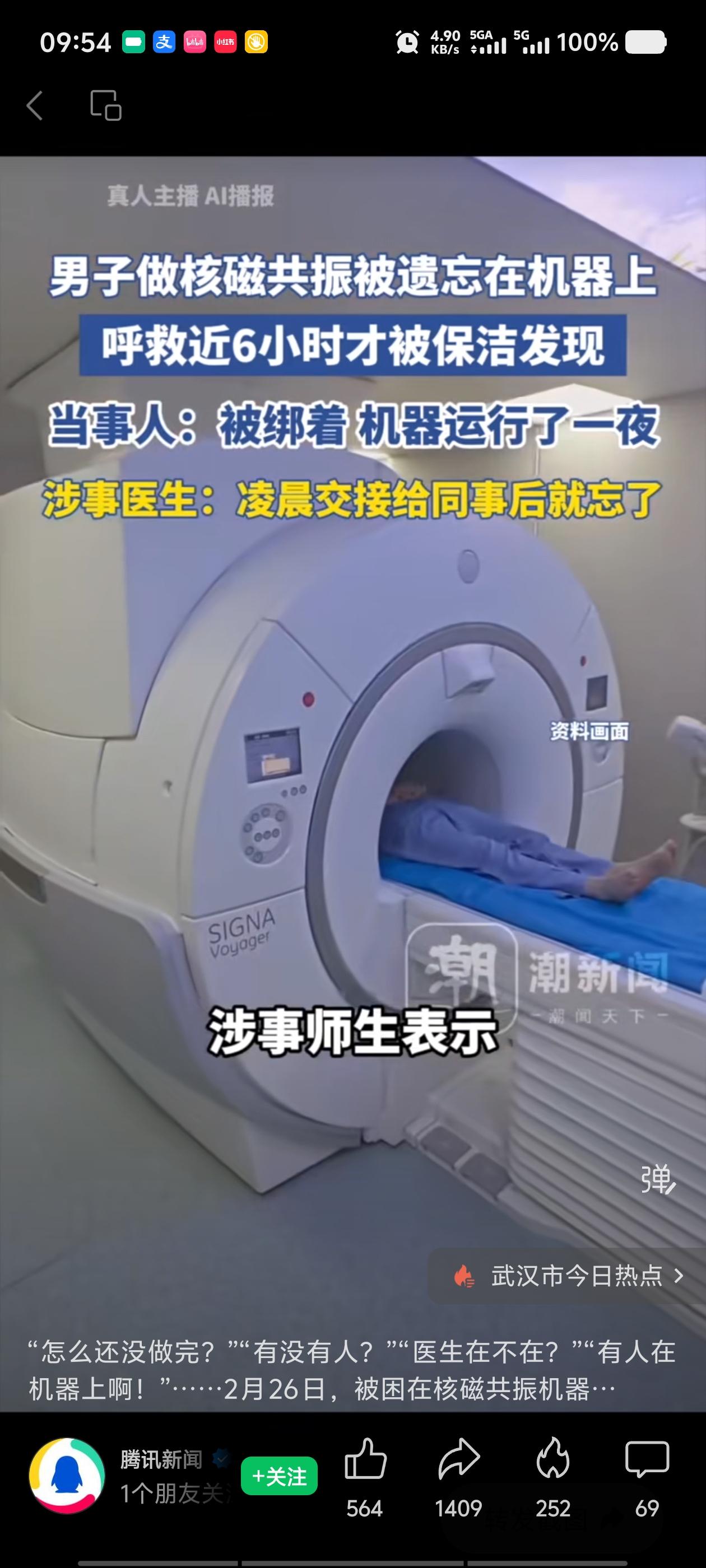 这是2025年2月25日发生在湖北武汉同济医院的一件事。 当天晚上,唐先生到医院做核磁共振检查。他按要求躺进机器,身体和头部都被固定好,戴上了面罩,医生启动机器后就离开了。 机器做完检查自动停了,但医生没回来。 唐先生被死死固定在狭窄的仪器里,动不了,喊也没人听见。他就这么躺着,一直喊,喊到嗓子哑了,喊到累了,喊到绝望。 从晚上一直躺到第二天早上六点。 整整一夜,近六个小时。 直到第二天清晨,保洁阿姨来打扫卫生,听见仪器里有微弱的呼救声,才发现他还困在里面,赶紧把人放了下来。 事后医院回应说,启动机器的医生忙其他事提前走了,同事也忘了检查,就把这事忘得一干二净。目前两名涉事医生已被停职,院方建议唐先生走司法途径。 唐先生事后接受采访,声音里还带着后怕:身体被固定着,头也被固定着,戴着面罩,机器运行时有噪音,我呼救了一夜,喊累了…… 目前,两名涉事医生已被停职。院方建议唐先生走司法途径解决。
