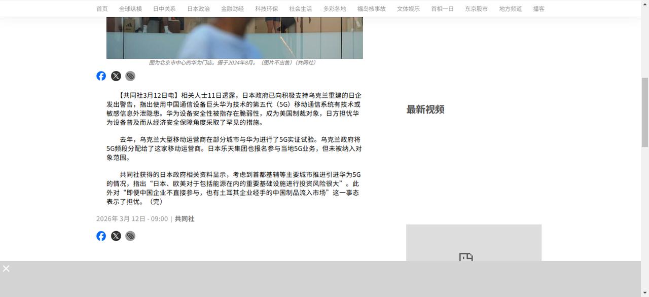 日媒曝日本警告日企弃用华为5G,无凭无据的操作藏着多重算计。 日媒(图):【共同社3月12日电】相关人士11日透露,日本政府已向积极支持乌克兰重建的日企发出警告,指出使用中国通信设备巨头华为技术的第五代(5G)移动通信系统有技术或敏感信息外泄隐患。 华为设备安全性被指存在脆弱性,成为美国制裁对象,日方担忧华为设备普及而从经济安全保障角度采取了罕见的措施。 日方这番罕见操作,看似是为了守护自身经济安全,实则连一点拿得出手的证据都没有。所谓“华为设备有安全隐患”,从头到尾都是没有实锤的猜测,连一份正规的检测报告都拿不出来。 熟悉行业的都知道,华为的5G设备早就经过了全球多个国家和国际机构的严格检测,安全性完全符合国际标准。 国家相关认证机构的结果也显示,华为多款路由器、交换机等设备,都通过了安全认证,有效期覆盖至今。 截至目前,华为已经在全球270座城市实现5G-A连续覆盖,和170多家运营商建立了合作关系。这么多国家都在放心使用,偏偏日本跳出来说有隐患,难免让人觉得不对劲。 其实日方的担忧,根本不是什么信息安全,核心还是跟着美国的步调走。2026年以来,美国一直在向盟友施压,要求限制华为在全球5G市场的布局,日本作为美国在亚太地区的重要盟友,自然要积极响应。 更耐人寻味的是,这背后还有日本本土企业的影子。去年乌克兰推进5G合作实验项目时,日本乐天集团带着自己的技术方案竞标,结果被华为击败,错失了乌克兰的5G建设名额。 这次日本政府向参与乌克兰重建的日企发出警告,说白了就是想给乐天集团铺路,借着“安全”的幌子,让日企优先选择本土设备,帮乐天夺回失去的市场份额。 可能有人会问,日本这么做,就不怕损害自身利益吗?答案是肯定的,但他们还是选择了妥协。要知道,华为每年都会从日本采购大量零部件,规模高达数千亿日元,一旦彻底排斥华为,不少日企都会受到冲击。 之前美国对华为实施制裁时,日本多家芯片企业就被迫停止向华为供货,直接损失超过1万亿日元。索尼、瑞萨电子等知名日企,都因为这件事下调了投资计划,经营压力大幅增加。 再说乌克兰那边,其实此前泽连斯基政府曾公开表示,欢迎华为参与乌克兰重建,认为华为的技术能帮助当地快速恢复通信设施。只是在美国和日本的双重施压下,才传出可能限制华为参与的传闻。 但截至目前,乌克兰官方并没有发布正式的限制公告,还明确表示5G建设会遵循市场化原则,不会被外部政治压力干扰。华为也作出回应,称会遵守当地法律,愿意继续推进合作。 说到底,日本这次采取的罕见措施,就是一场掺杂着地缘利益和商业竞争的算计。没有任何证据就抹黑华为,既违背了市场经济规律,也损害了日企自身的利益。 现在全球5G产业都在快速发展,技术合作才是大势所趋。任何以“安全”为借口打压他国企业的行为,最终只会搬起石头砸自己的脚,不仅会阻碍行业发展,还会失去更多合作机会。
