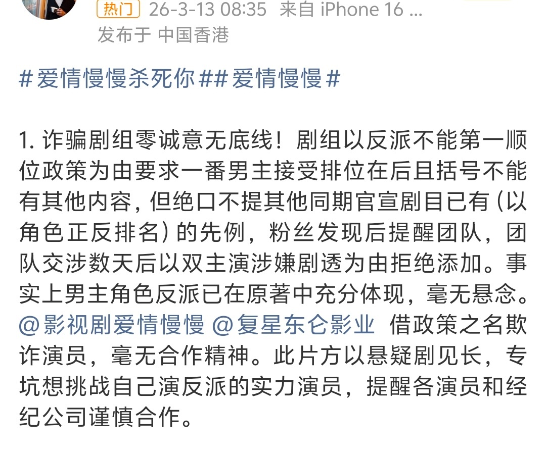 爱情慢慢开机,陈伟霆粉丝在维权,称剧方以男主为反面角色的理由让陈伟霆二番(?)