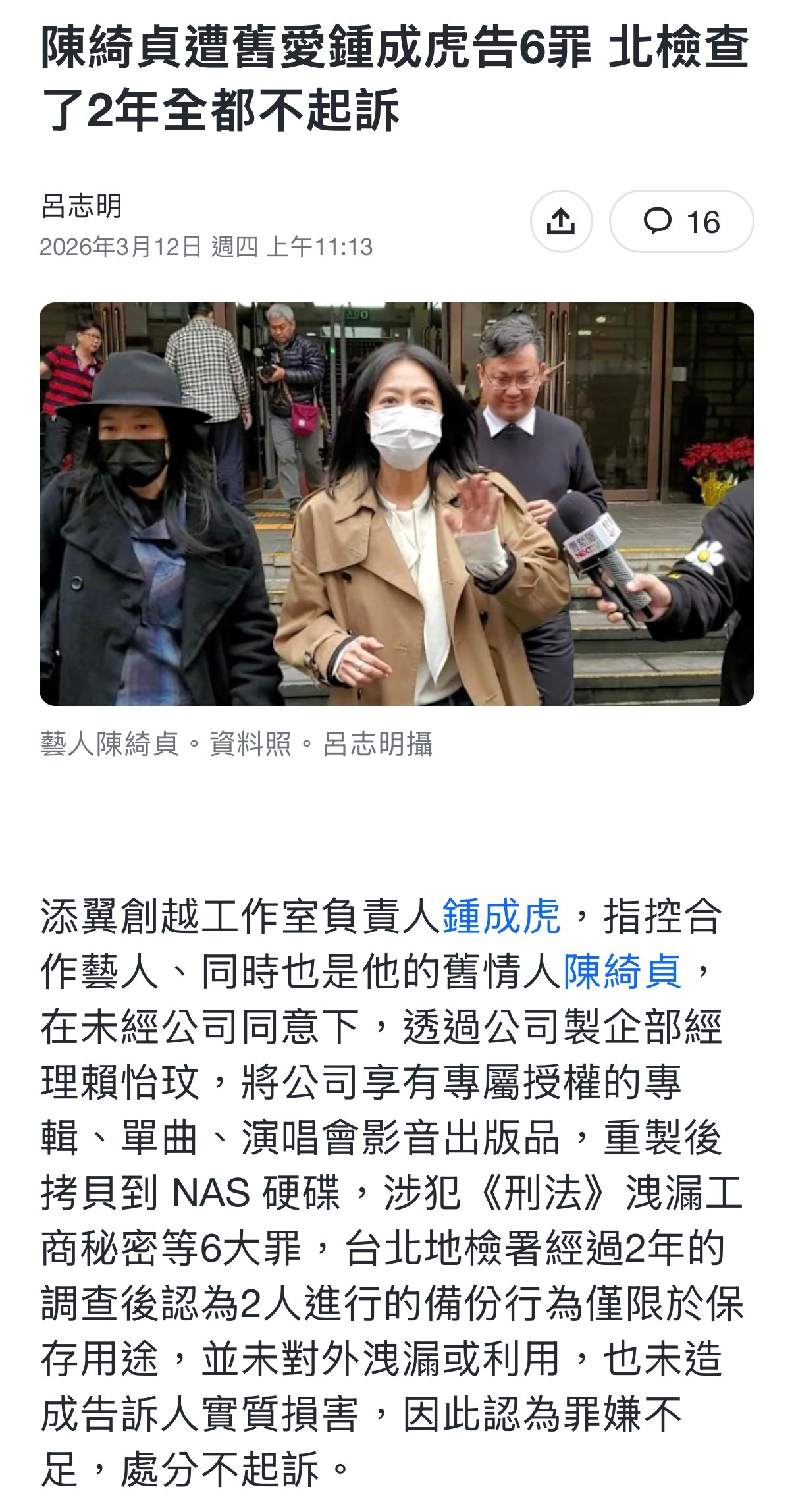 好消息!陈绮贞遭钟成虎提告6罪全获不起诉!!!