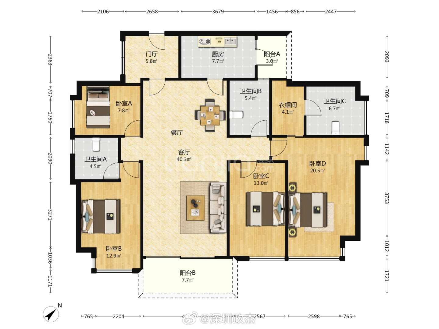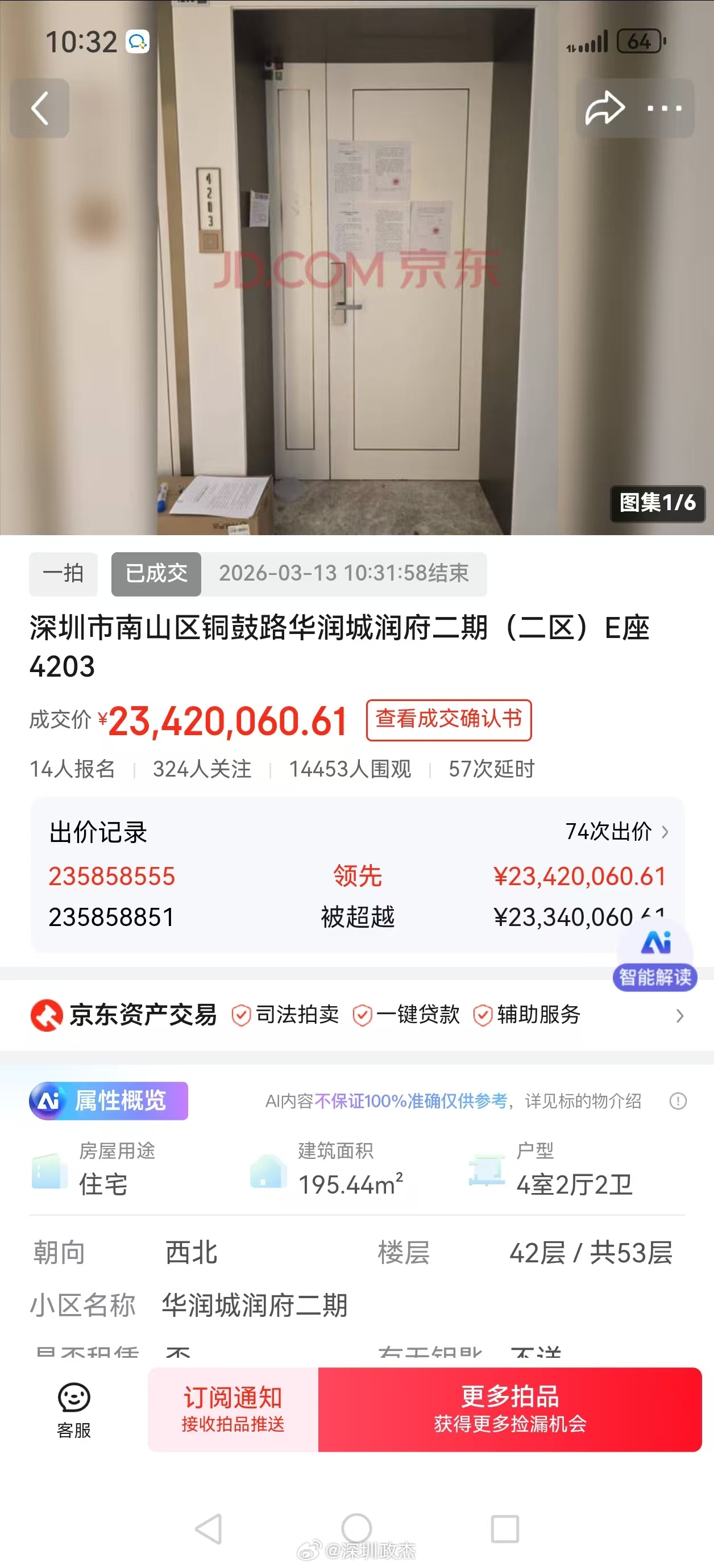 华润城起飞,润府二期今日法拍195平2342万成交,单价12万。这套房超高层看城
