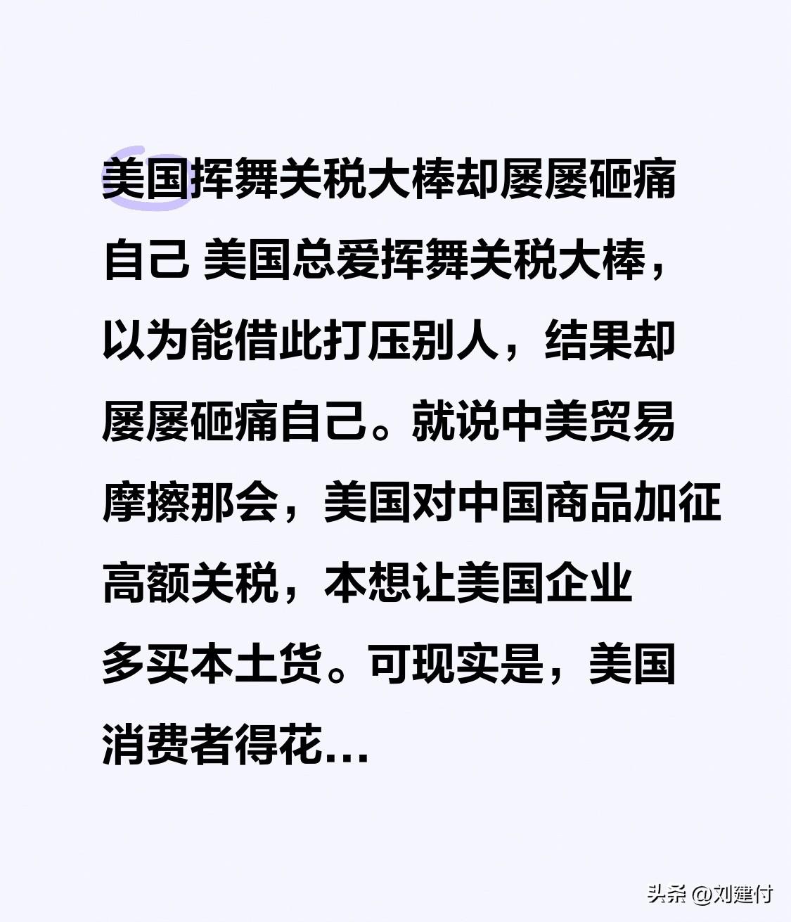 美国挥舞关税大棒却屡屡砸痛自己 美国挥舞关税大棒,却常自食恶果。美国总热衷于挥舞关税大棒,妄图借此打压他国,结果却总是搬起石头砸自己的脚。 就以中美贸易摩擦为例,美国对中国商品加征高额关税,本想促使美国企业多采购本土产品。但现实是,美国消费者购物成本增加,企业成本也大幅上升。以美国汽车行业为例,关键零部件进口成本上升,压缩了企业利润空间。此外,美国农业也深受其害,农产品出口受阻,农民收入减少。 美国这种损人不利己的行径,最终让自己付出了沉重代价,这关税大棒砸得着实不轻!