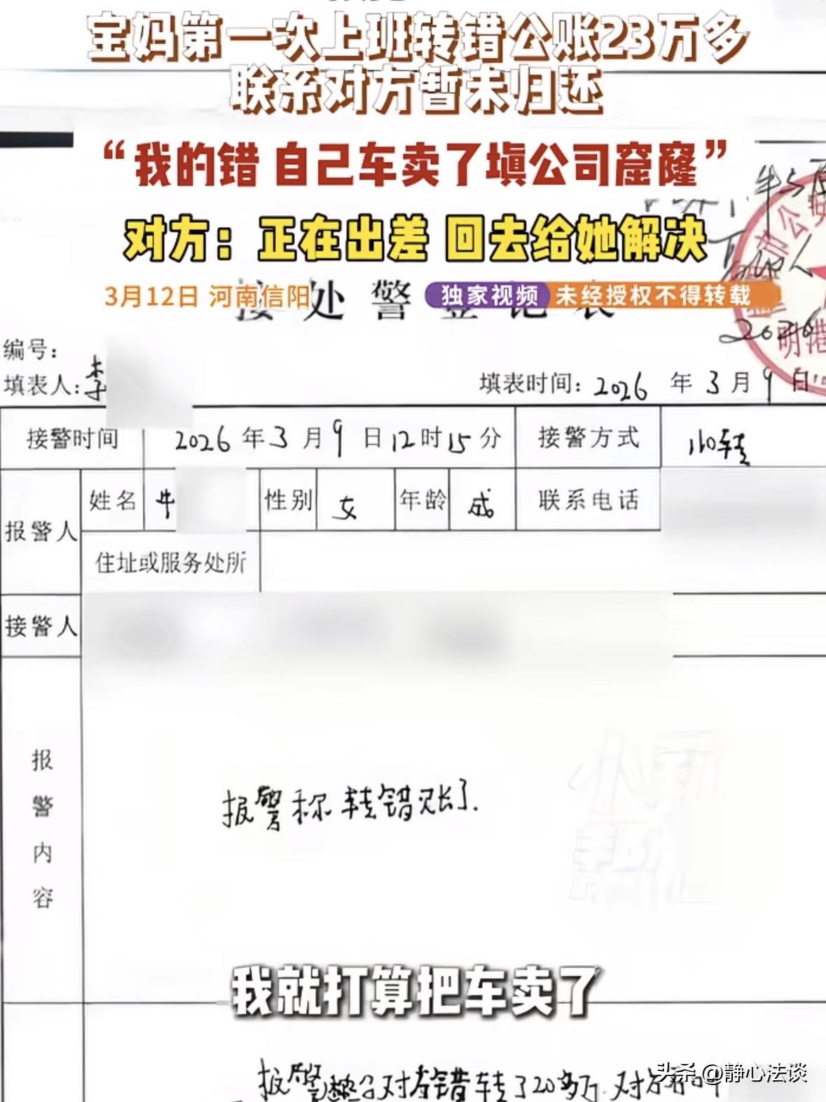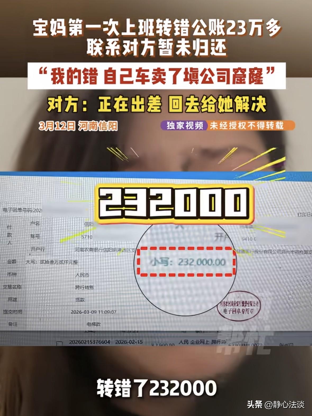 成年人的崩溃,就在一瞬间!河南信阳,一位宝妈之前一直全职带孩子,刚第一天上班就误将23万元转错账户,女子吓坏了,赶紧联系对方,可对方说自己在出差,没有带U盾,等回去给他解决,女子表示只要把钱退回来,自己个人愿意拿出2万元作为感谢,事发之后,女子表示都是自己的错,愿意承担全部责任,真要是要不回来把车卖了也会填这个窟窿。 牛女士揣着忐忑又期待的心情走出家门,这是她告别家庭重返职场的第一天。 满心想着好好干,兼顾起孩子和生活,可谁能想到,这一天还没熬到黑,就犯了个无敌大错。 牛女士干的是和财务相关的活,转账本就是容不得半点差错的事。 第一天上手,老板让她了他一个账号,转过去23万,她眼睛盯着屏幕,手指点着键盘,就怕出错。 可越怕出错越出错,一个不小心账号就输错了。 还她还没反应过来,直到系统提示转账成功。 盯着那串和公司对接账号完全不同的数字,她的脑子嗡的一下,一片空白。 那是23万多,不是三块五块,也不是三千五千。 那一刻,办公室里的声音仿佛全都消失,她只听见自己咚咚的心跳声,手心全是汗,腿软得不像话。 她不敢相信自己犯了这么低级又致命的错,一遍又一遍刷新页面,盼着是系统出了问题。 可转账成功的提示就摆在那里,刺得她眼睛生疼。 她第一时间联系了领导,声音带着哭腔,把事情的来龙去脉说了一遍。 她知道是自己的错,没有找任何借口,只重复一句都是我的错,我来承担。 领导的话里有惋惜,也有无奈,公司的钱不是大风刮来的,这笔错转的钱,必须尽快追回来。 她赶紧报警,尝试联系收款方,后来电话打过去,对方说自己正在出差,没有带U盾,等回去之后会解决。 这一句回去解决,像一根救命稻草,又像一块悬在半空的石头,让牛女士心里七上八下。她 不知道对方说的是真话还是托词,不知道这23万多能不能顺利追回来,更不敢想如果追不回来的后果。 她表示要是实在要不回来,自己愿意把车卖了填这个窟窿。 出事以后她坐在办公室的角落,看着窗外人来人往,眼泪忍不住往下掉。 想起自己为了重返职场,提前好久就开始做准备,跟家人反复确认孩子的照顾问题。 想起出门前孩子奶声奶气地说妈妈加油,想起自己当初满心的憧憬,只觉得心里又酸又涩。 不过是第一天上班,自己就犯了这么大一个错,她开始怀疑自己。 有人说成年人的世界,从来都没有容易二字,而宝妈的世界,更是多了一层身不由己。 一边是割舍不下的孩子,一边是想要站稳脚跟的工作。 一边是柴米油盐的生活压力,一边是职场上的步步谨慎。 本就顶着双倍的压力,如今连崩溃都要偷偷摸摸,怕被同事看见,怕让家人担心。 其实都知道她不是故意的,可职场里从没有无心之失的豁免权,错了就是错了,后果总要有人承担。 现在牛女士不管怎么后悔都没用,毕竟这世上没有后悔药,再多的如果,也换不回已经转出去的23万。 现在只能盼着,那位收款方把不属于自己的钱还回来,盼着牛女士能渡过这道难关。 也盼着今后她的职场路,能少一点坎坷,多一点顺遂。 毕竟,努力生活的人,都值得被温柔以待。 《民法典》第958条:得利人没有法律根据取得不当利益的,受损失的人可以请求得利人返还取得的利益,但是为履行道德义务进行的给付、债务到期之前的清偿、明知无给付义务而进行的债务清偿这三种情形除外。 牛女士因操作失误将23万多公账转至对方账户,收款方取得该笔款项,没有任何合同、债务等合法依据,属于典型的不当得利。 而牛女士的公司因这笔错转产生了23万多的财产损失,且损失与收款方的获利存在直接的因果关系,完全符合不当得利的构成要件。 因此牛女士所在公司作为受损失方,有权依法要求收款方返还全部23万多款项。 @静心法谈 学法辨是非,慬法不吃亏。