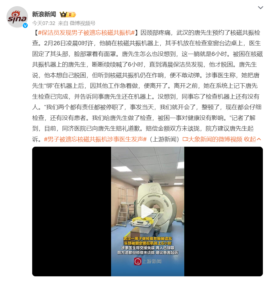 保洁员发现男子被遗忘核磁共振机 上热搜了,男子夜里10点排队,12点做核磁,医生以为没人直接走了,结果被遗忘在机器上6小时,颈部固定,机器一直转,不敢动窝,叫天天不应叫地地不灵,直到早上被保洁员发现,现在涉事医生被停职,赔偿金没有协商好,男子身体出现xue微异常......