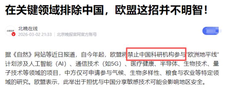 欧盟这波操作,真是又蠢又短视!历史又要重演了! 欧盟正式官宣:禁止中国参与总预算930亿欧元的“地平线欧洲”核心计划,AI、量子、半导体、生物技术四大前沿领域全面封锁。 欧盟的新政其实早有苗头,早在2025年12月,欧盟委员会就已正式敲定未来两年该项目的“核心门槛”,明确将这四大领域的中国实体一律请出局,这份封锁名单覆盖面极广,不只是国内的高校和研究所无法参与。 哪怕是在欧洲设点、背后和中国沾亲带故的公司,也难逃被排斥的命运,尤其是“国防七子”,更是被直接列为明令禁入对象,连一丝参与的可能都没有。 欧盟这波操作,说白了就是没美国的命,却得了美国的“小院高墙”病,跟风搞技术封锁,骨子里全是对中国科技发展的忌惮,嘴上却还挂着所谓“保护知识产权”“防范技术外流”的借口,显得格外滑稽。 早年间中欧就有过类似的闹剧,当年中欧联手推进伽利略卫星导航计划,中国实打实投了2.7亿美元,结果美方一施压,欧盟就立马翻脸,把中国踢出局。 可后续的发展狠狠打了欧盟的脸,伽利略计划进度拖沓、故障不断,反观中国北斗系统,后来居上,如今早已能自信地为全世界提供服务,成为全球导航领域的重要力量,现在欧盟又故技重施,显然是没吸取当年的教训。 欧盟口中的“安全顾虑”,其实根本站不住脚,负责管理“地平线欧洲”计划的欧盟官员曾辩解,当下是地缘政治关键时期,必须谨慎选择合作对象。 可英国肯特大学的社会学家直接戳破了这层遮羞布,指出知识产权盗窃大多发生在商业领域,和搞前沿基础研究的科研人员毫无关系,欧盟这波操作,纯粹是把科研合作政治化、泛安全化,用莫须有的理由切断合作。 在前一轮“地平线2020”计划中,中国可是所有非欧盟国家中参与度最高的,两百多家中国机构深度参与各类项目,贡献了大量优质的科研思路和技术支持。 截至2025年底,还有107个中欧合作项目在推进,这些项目涵盖多个前沿领域,本来能实现互利共赢,可欧盟却硬生生按下暂停键,把中国的科研力量拒之门外。 更可笑的是,欧盟并没有把门关死,还留着气候、生物多样性、粮食和农业等非核心领域的合作口子,这种“既要又要”的操作,说白了就是舍不得中国的科研资源和庞大市场,一边想在非核心领域蹭中国的合作红利,一边又怕中国在核心领域追上甚至超越他们,典型的首鼠两端。 现在的中国科技实力,早已不是当年那个需要依附他人的样子,AI领域,中国的专利占比接近60%,是全球最大的AI专利持有国,DeepSeek、Seedance等大模型频频惊艳世界。 量子领域,潘建伟团队研制的“祖冲之三号”量子计算原型机,处理特定问题的速度比超算快千万亿倍,打破了超导体系量子计算优越性的世界纪录。 半导体和生物技术领域,中国也在快速突破,不断补齐短板,这样的发展速度,让欧盟坐立难安,才急着出台封锁政策。 欧盟以为靠封锁就能保住自己的技术优势,却忘了科研的本质是开放合作,“地平线欧洲”计划的核心目的本是提升欧洲的竞争力。 可现在他们主动切断和中国的联系,相当于自己放弃了全球最庞大、最活跃的科技人才和应用场景,后续科研项目缺乏了中国的海量数据和迭代经验,进度必然会受影响,甚至可能被其他国家拉开差距。 那些在欧洲设点的中国关联企业,本是中欧技术交流的桥梁,却被欧盟一刀切排斥,不仅损害了这些企业的利益,也让欧洲本土科研团队失去了重要的合作伙伴,很多需要跨领域协作的项目,只能被迫调整方向,变得越来越保守。 欧盟口口声声说要实现“战略自主”,减少对美国的依赖,可实际行动却完全跟着美国的节奏走,照搬美式技术封锁套路,最终只会让自己陷入孤立。 毕竟在全球科技一体化的今天,闭门造车只会越走越慢,当年伽利略计划的失败已经证明了这一点,如今欧盟又重蹈覆辙,不得不说,这种短视的操作,最终伤害的只会是欧盟自己。