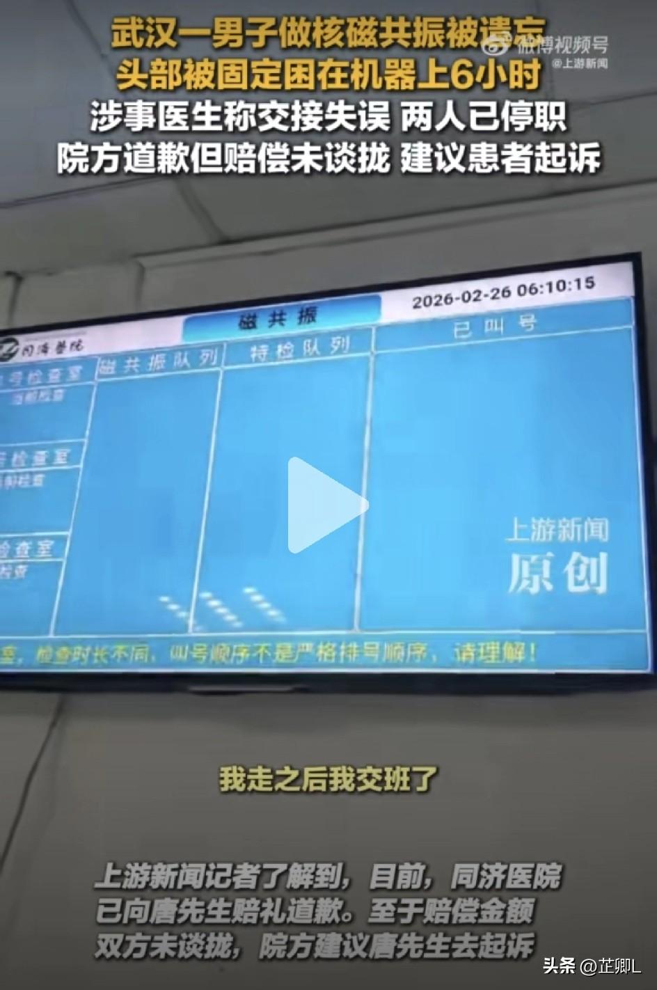 吓懵了!男子凌晨做核磁共振,却被遗忘在机器上高达6小时,喊破喉咙没人应,天亮才被保洁阿姨救下来! 武汉这男子可太倒霉了!因为脖子疼去医院做核磁共振,竟被医生直接忘在机器上整整6个小时,喊到嗓子哑都没人理,最后还是保洁阿姨打扫卫生才把他救出来,太离谱了! 2月25号晚上,唐先生因为脖子疼,预约了某医院的核磁检查。 凌晨零点左右,他躺上2号检查室的机器,医生把他头部固定好、罩上面罩,就再也没回来。 原本20分钟就能做完的检查,唐先生躺了半小时却没等来任何动静,便开始喊人: “怎么还没做完?” “有人在吗?” “医生去哪了?” “机器上还有人啊!” 可不管他怎么大声呼喊,外面是一点回应都没有。 他想自己下来,却又听见机器还在响,因为不懂就不敢乱动,就这么一遍遍呼救,累了歇一会,恢复力气接着喊,硬生生熬了6个小时! 直到第二天早上6点,保洁员来打扫卫生,才发现检查室里还困着个人,赶紧喊来保安,唐先生才被松开救下来。 更离谱的是,就因为唐先生迟迟不回家、电话也不接,妻子急得跑到医院去找,还报了警。 可医院系统居然显示:唐先生凌晨0点10分已经做完检查离开了! 民警调监控没找到人,保安也坚称他早就走了,妻子在医院里急得像热锅里的蚂蚁团团转,却压根不知道丈夫一直被困在核磁机器上! 事后涉事医生坦白:当时给唐先生固定好后,自己有急事要忙,走之前直接在系统里录了检查完成,只跟同事提了一句病人还在机器上,结果同事转头就忘了,俩人把患者彻底抛在脑后! 目前这两名医护人员都被停职,科室也整改了,医院也道了歉,但赔偿金额没谈拢,院方让唐先生直接起诉。 专家说,核磁机器一直响是因为机器需要维持极低温和稳定磁场,所以通常不会随便关机。 核磁共振没有辐射,对唐先生身体没造成伤害,但这心理阴影得多大啊! 看来,这以后去医院做检查看病还是不能一个人去,最好有家人陪同,万一出现唐先生这样的情况,也能马上发现。 好好做个检查,被孤零零困在机器上6小时,换谁都得崩溃!医院这操作也太不负责了,简直让人后怕! 素材来源:上游新闻,侵联删!