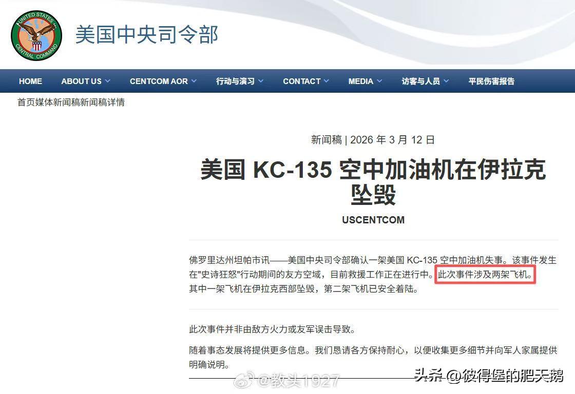 快讯!一架KC-135同温层加油机据称被伊拉克抵抗运动发射的P-358防空导弹击中。初步报告显示三名美国士兵死亡。 伊拉克抵抗运动指示任何发现残骸者联系两圣寺广播电台,暗示飞机可能在伊拉克-沙特边境地区坠毁。 美国中央司令部确认--架美国KC-135空中加油机失事。该事件发生在"爱泼斯坦狂怒"行动期间的友方空域,目前救援工作正在进行中。 此次事件涉及两架飞机。 其中一架飞机在伊拉克西部坠毁,第二架飞机已安全着陆。 当然,美军否认了是敌军袭击所致。 #热点观点# #美伊以冲突# #伊朗导弹技术的未来发展趋势如何#