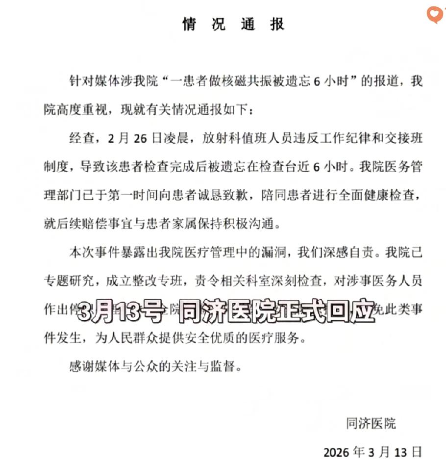 去医院做个检查,居然被忘在核磁共振床上近6小时? 武汉唐先生凌晨躺上检查床,头被固定、戴着面罩,本20分钟能完成的检查,却因医生交接失误被“遗弃”。 他断断续续呼救6小时,机器轰鸣中不敢动弹,直到清晨被保洁员发现才脱困,而系统上早已被标注“检查完成”。 两名涉事医生被停职,但这根本不是“疏忽”那么简单。医疗流程里的书面交接、患者复核,哪一步不是为了避免风险? 医院道歉了,但赔偿谈不拢就建议起诉,这态度也太敷衍了吧? 医疗行业早有明确的交接班制度,要求专人专责、签字确认,这根本不是“疏忽”,是把患者安全当儿戏。 口头叮嘱的随意、流程规范的形同虚设,暴露的是对患者生命安全的漠视。要是换成有基础病的老人,后果不堪设想。 医院的责任闭环不能只挂在墙上,患者的信任更容不得半点敷衍。 真正的医疗安全,从来不是靠事后整改,而是每一步都做到位。 你觉得医院该如何杜绝这类流程漏洞?遇到医疗疏忽,你会怎么维权?