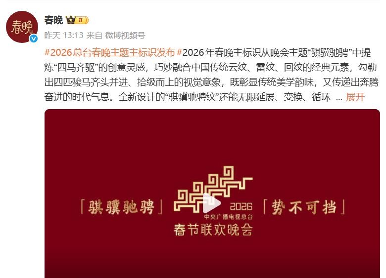 2025年12月10号,官宣了,2026年春晚主题,骐骥驰骋,势不可挡,还挺正式的,上了热搜,设计师说是从《楚辞》来的灵感,骐骥就是奇迹,还用了传统纹样,云纹,雷纹,回纹,看起来很有文化,又有设计感,可是,大家觉得怎么样呢。