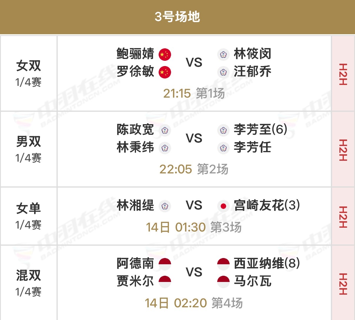 【一号场地】第⑤场次日01:00开始②🇨🇳李怡婧/王漪朵vs岩永铃/中西贵映🇯🇵⑤🇨🇳程星/张驰vs希达亚图拉/费丽莎🇮🇩⑥🇨🇳李诗沣vs 王柏崴ᴛᴘᴇ⑦🇨🇳朱一珺/李茜vs帕克卡波/沙西丽🇹🇭