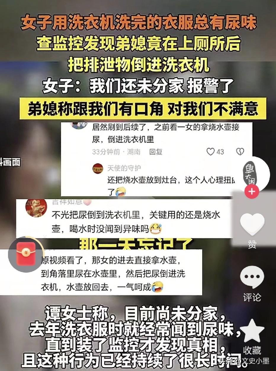 往嫂子烧水壶里撒尿,然后再倒进洗衣机里!摊上这样的弟媳妇,嫂子也算倒霉了! 广西一女子,过去一段时间总是觉得刚洗的衣服有一股怪味,很难闻,并且有时候喝的水也有怪味,让人恶心!他心里想,是不是有人在水里动了手脚! 为了一探究竟,她悄悄的在厨房里装了一个监控,终于有一天拍到了真相,原来是她的弟媳有时候会到厨房,在烧水壶里撒尿然后再把尿倒进洗衣机里面! 可以看到,她弟媳做这一切的时候,其孩子就在旁边,但她毫不避讳,也不担心教坏了孩子!这种事已经干了好几次了! 该女子表示她与弟媳还未分家,但厨房是她们自己的,她与弟媳之前有过小矛盾,发生过口角,但她没想到弟媳能干出这种缺德事来! 女子弟媳这样做有点不讲究了,毕竟大家都是一家人,坐下来聊一聊,没有解不开的结。现在可好,做了这么损的事,两家关系很难再修复了!