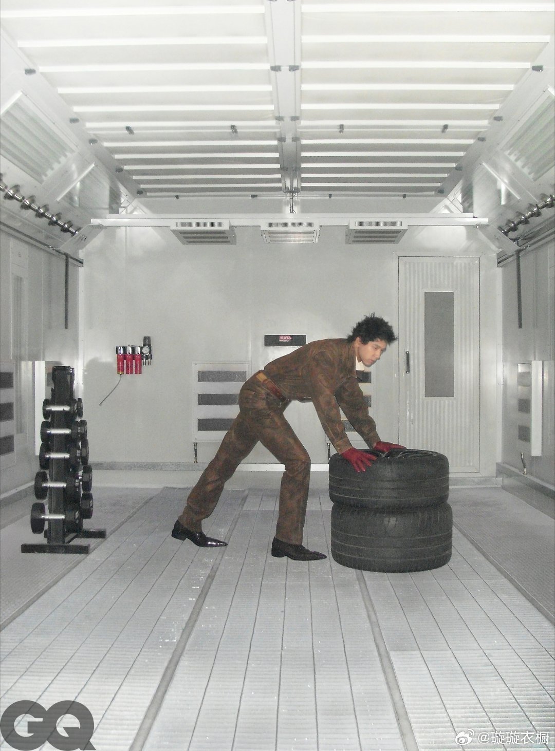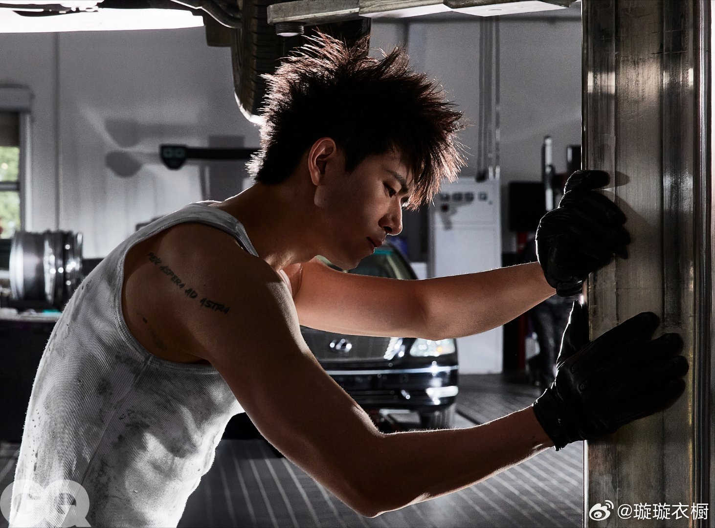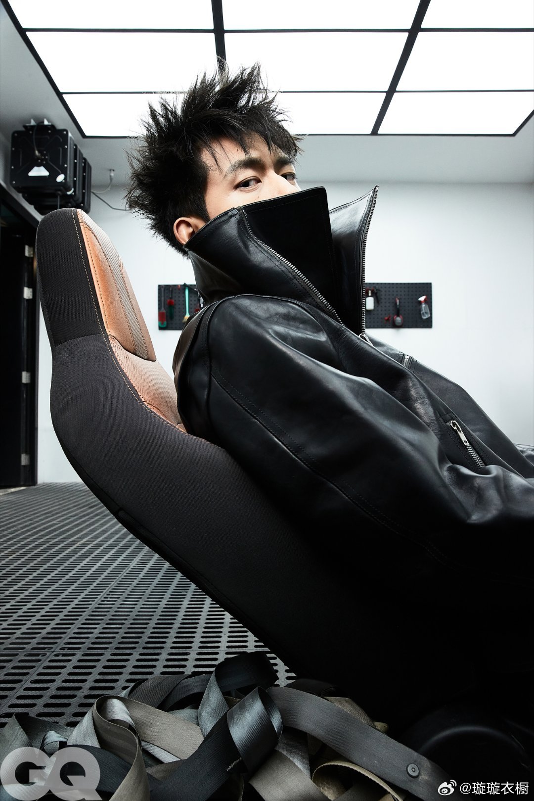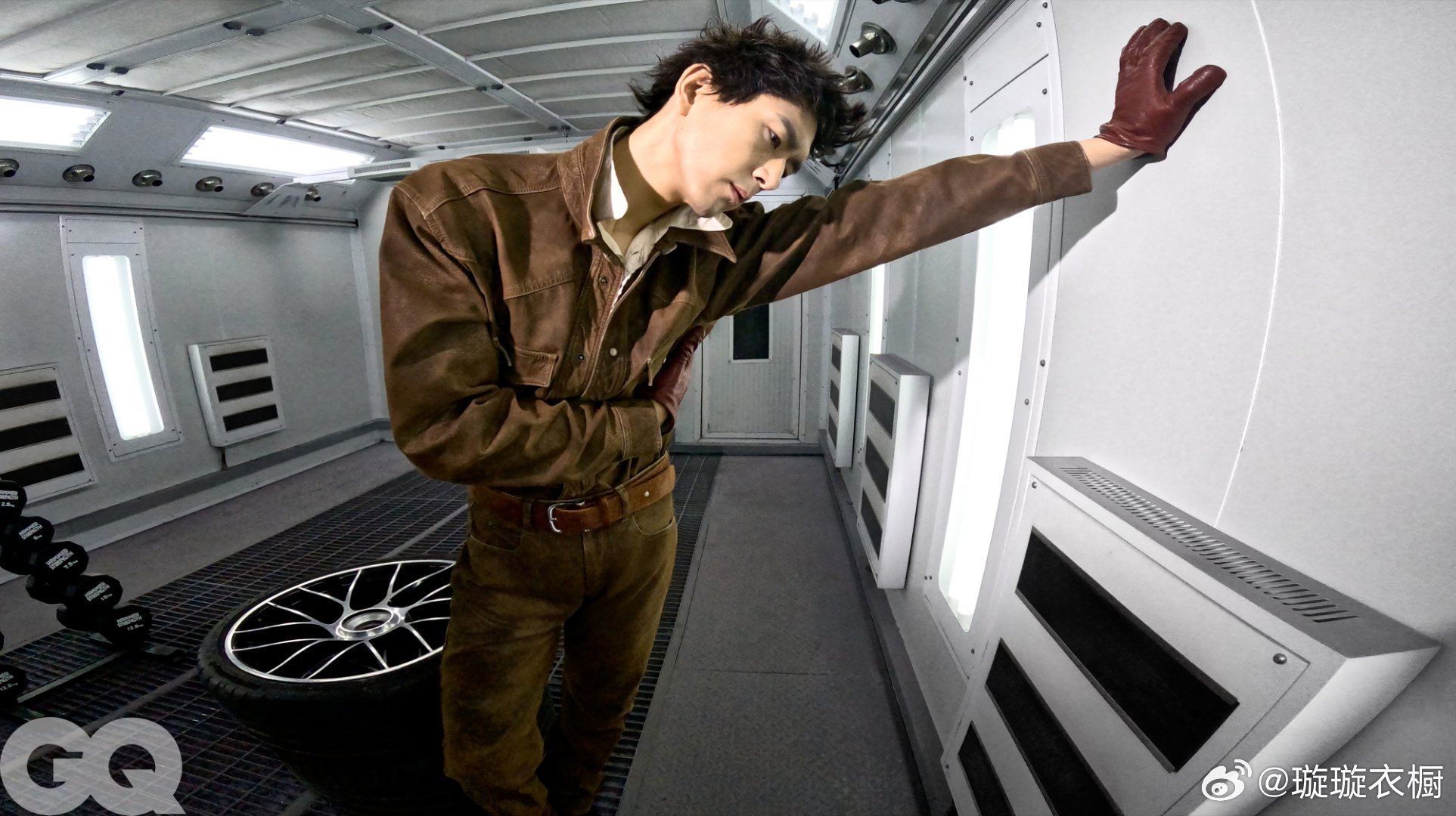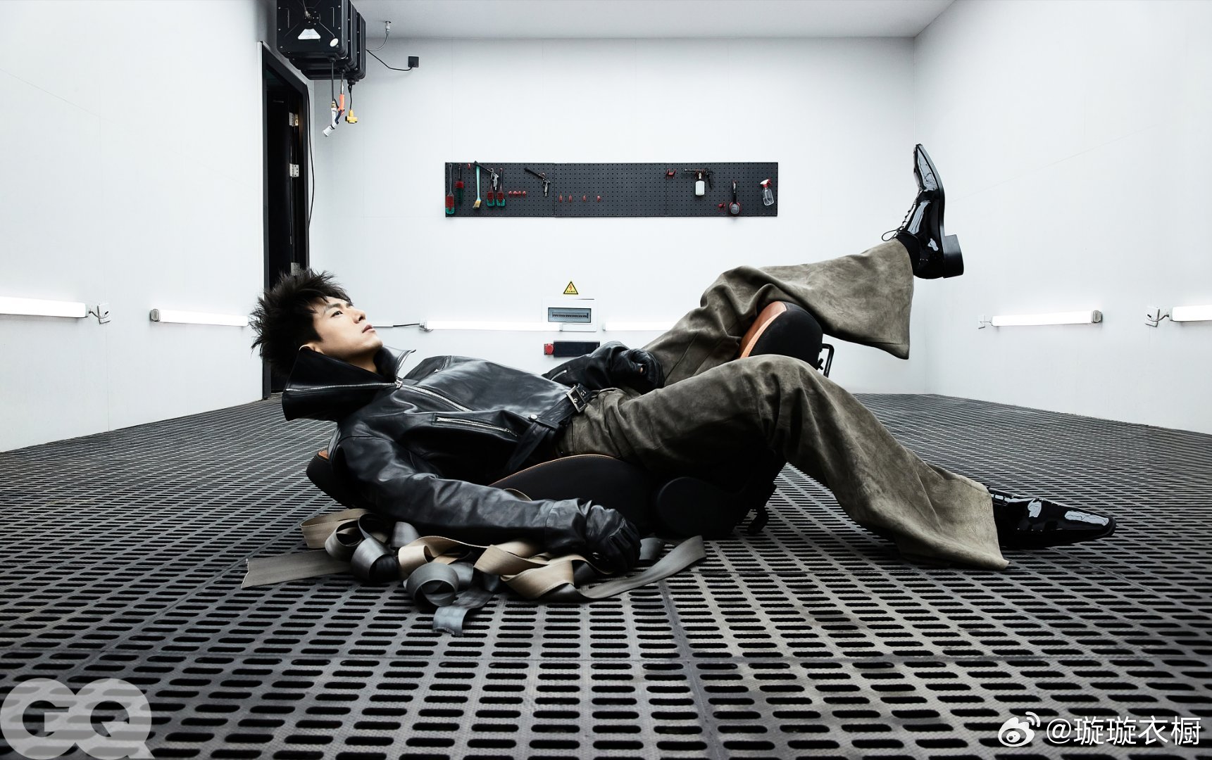 皮革夹克立领吞掉半张脸,金属网格地上躺着桀骜的影子。轮胎堆上的工装裤绷出力量线条,扳手在掌心转成银色流星。李现修车厂大片GQ三月李现封面