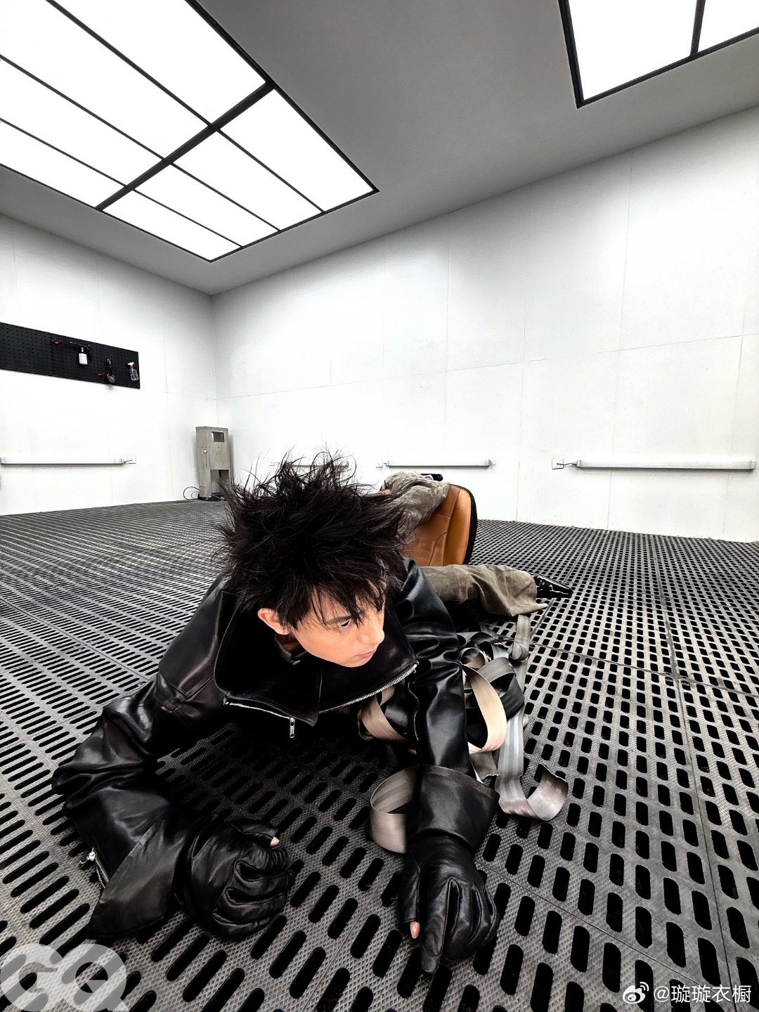 皮革夹克立领吞掉半张脸,金属网格地上躺着桀骜的影子。轮胎堆上的工装裤绷出力量线条