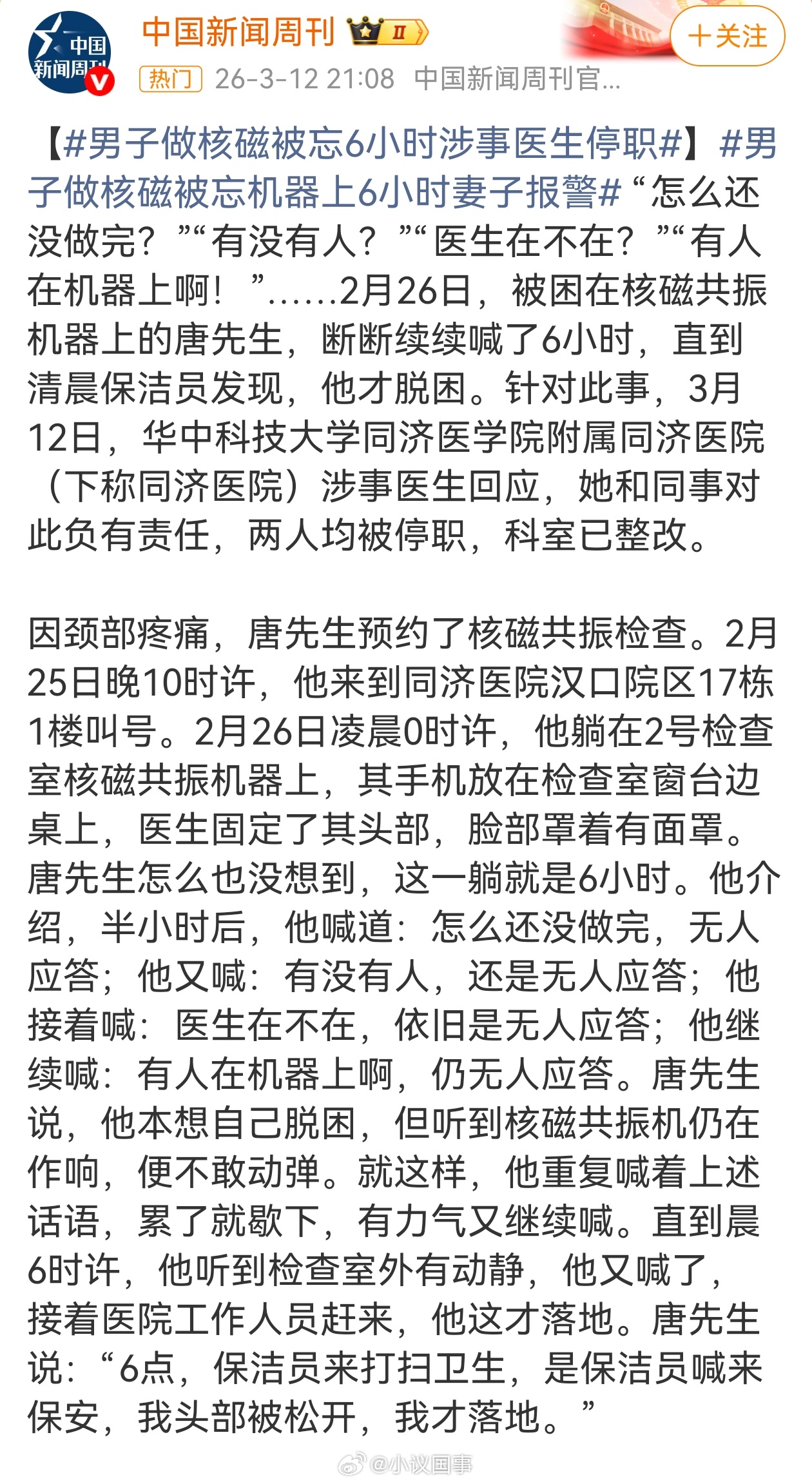 保洁员发现男子被遗忘核磁共振机这事真是太离谱了,可以想象患者当时有多恐惧和多煎熬。