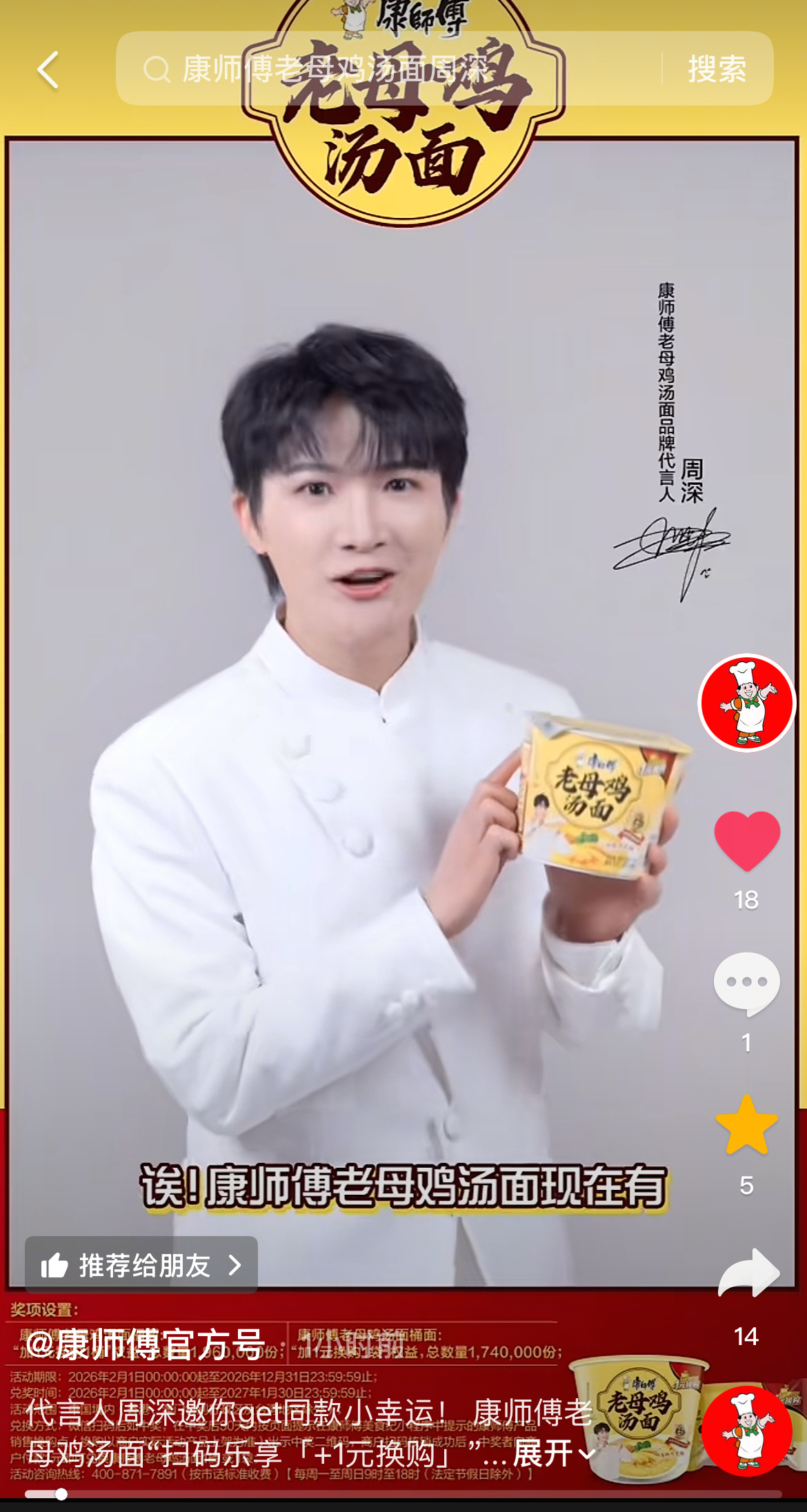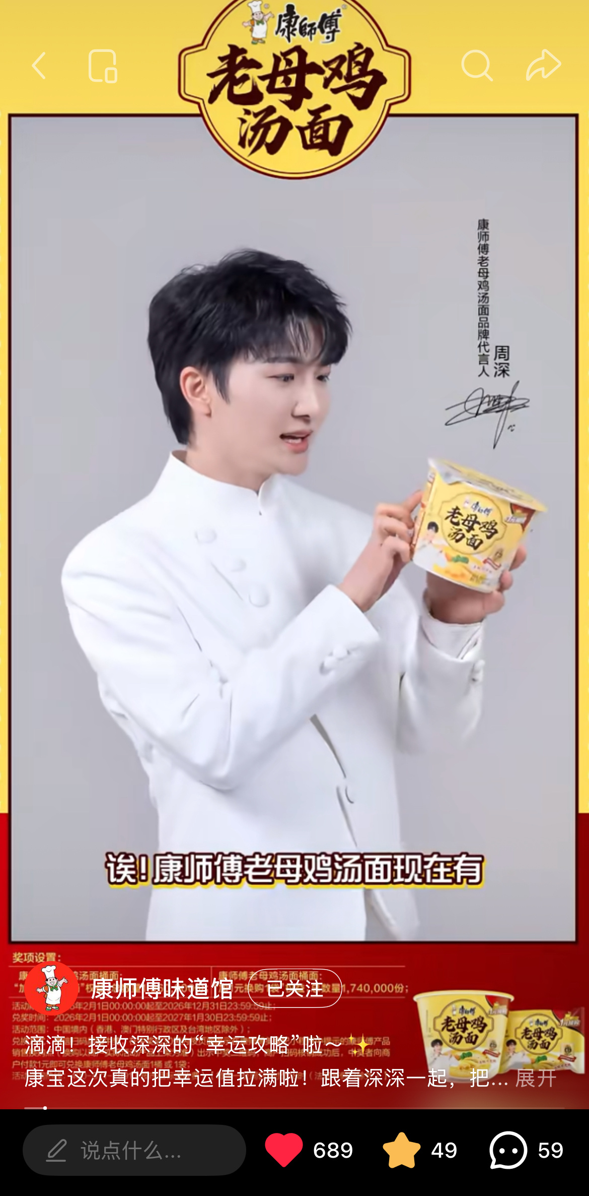 【康师傅】抖🫘和📕更新了深深相关物料米米们快来多多互动周深康师傅老母鸡汤面品牌代言人