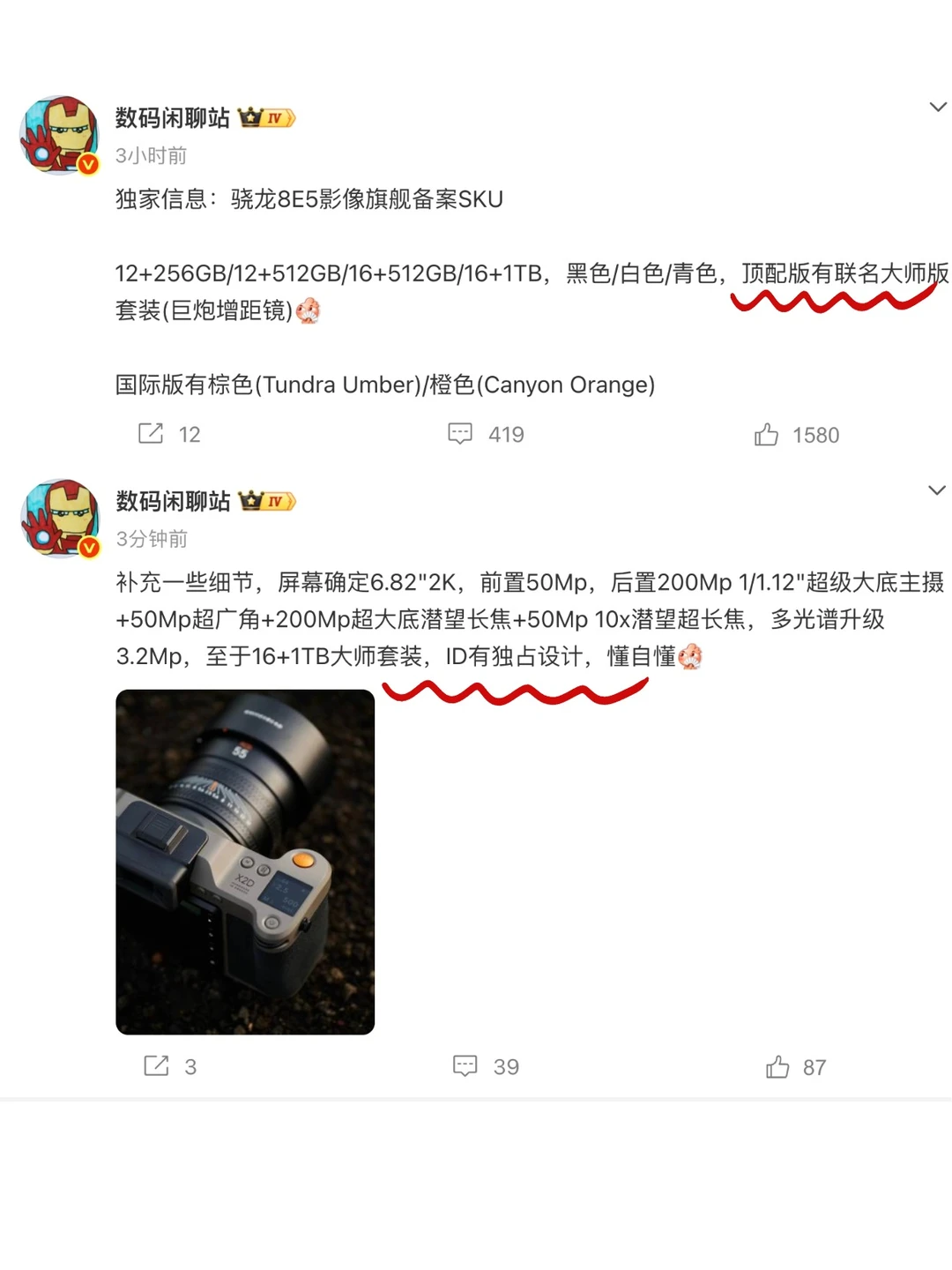 国产Ultra这边也没闲着,X300 Ultra据说有两款蔡司增距镜,但是这次新机主摄和长焦光圈都缩水了,进光量提升有限,体验上应该会有升级,只能期待了😭