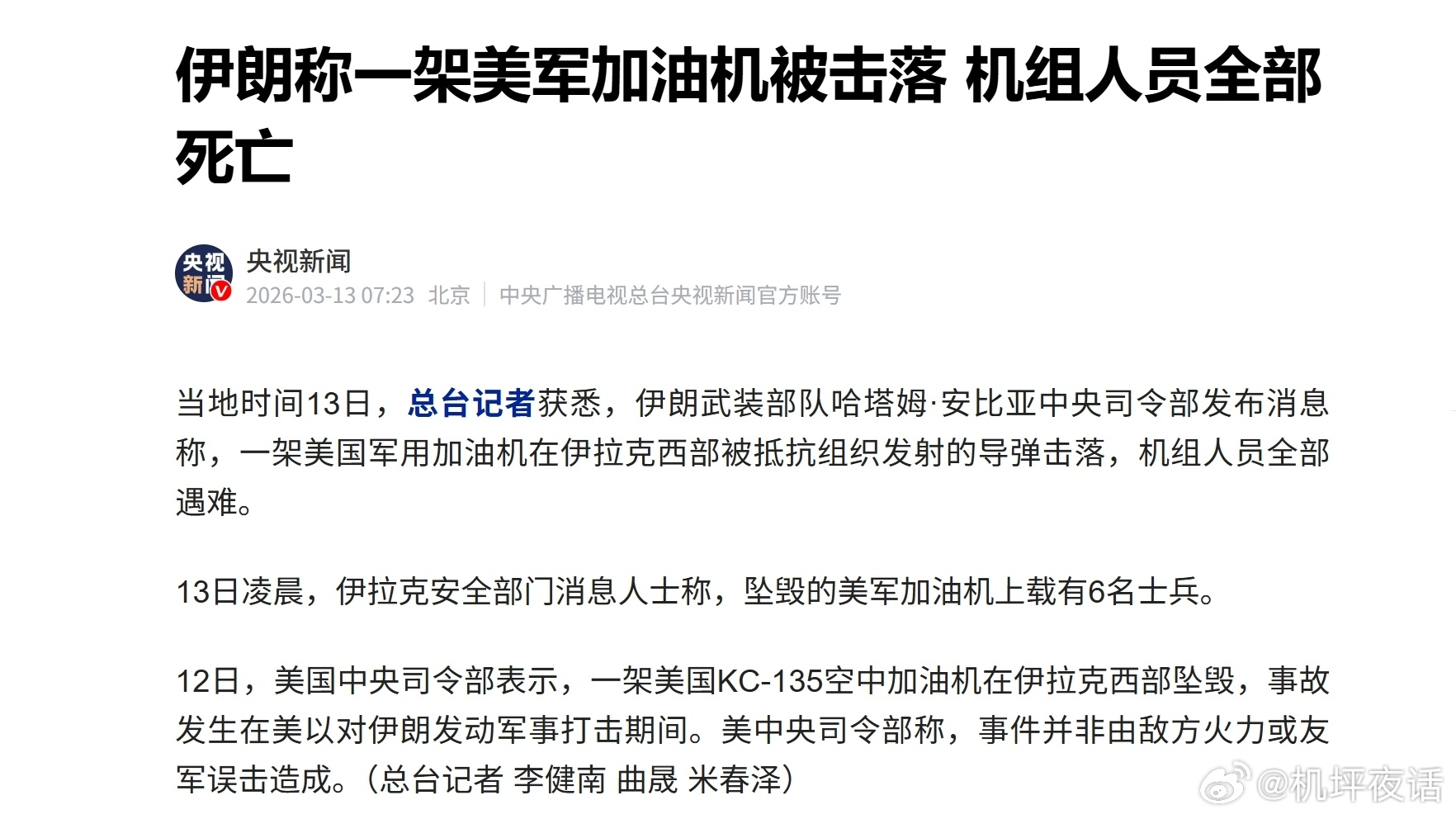 与美方“意外事故”的基调完全不同,伊朗国家电视台13日援引伊朗武装部队哈塔姆·安比亚中央司令部发言人的消息称,这架美军加油机是在伊拉克西部被“抵抗组织”发射的防空导弹击落的。伊朗方面宣称,机上的6名机组人员已在坠机中全部丧生,并表示这架飞机是在“正义报复的火焰”中坠落,机组人员为其侵犯主权土地的行为付出了生命代价(图3)。