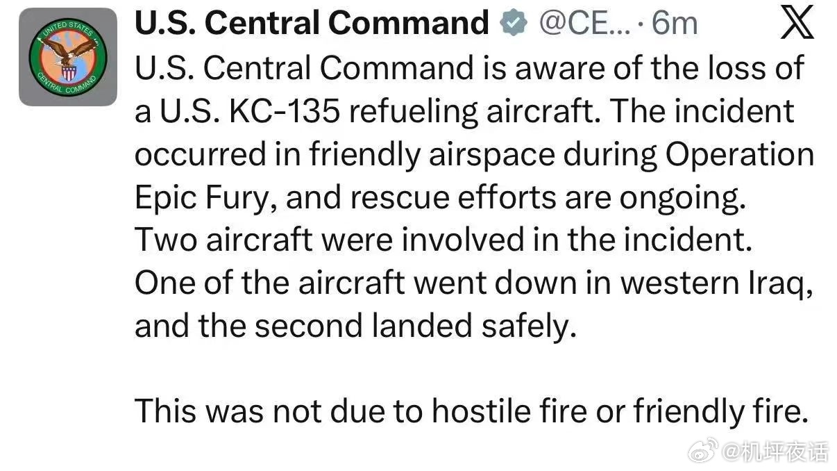 据美国中央司令部12日发布的声明,这架KC-135空中加油机是在参与美以针对伊朗的军事行动(代号“史诗狂怒行动”)期间,于“友军控制空域”内坠毁的。美军在声明中明确指出,此次事件“并非由敌方火力或友军误伤所致”(图2)。