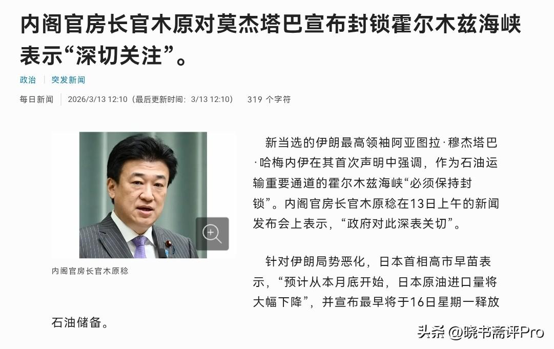 日本明显是急了!在伊朗最高领导人穆杰塔巴·哈梅内伊在其首次声明中强调,作为石油运输重要通道的霍尔木兹海峡“必须保持封锁”之后,日本出来表态了!3月13日,日本内阁官房长官木原稔在新闻发布会上表示,政府对此深表关切。我们已多次向伊朗强调确保霍尔木兹海峡航行安全的重要性。日本将与包括七国集团在内的相关国家密切合作,尽快控制局势。 而高市早苗则表示,预计从本月底开始,日本原油进口量将大幅下降。很显然,现在的局势对于日本可以说非常的不利。日本的石油进口90%依赖于中东,而在俄乌冲突之后,日本对俄罗斯还在进行制裁。原本日本可以进口俄罗斯的石油作为缓冲,现在看来当初的制裁令只能说这完全是搬起石头,砸了自己的脚。 事实上,现在日本内部也在讨论是否放开对俄罗斯的制裁。但是,日本明显也感到非常为难,不放开,自己难受;放开,日本的制裁令是一个笑话不说,还会彻底得罪美国,打乱美国对俄节奏。美国刚刚放出对俄油30天豁免,日本却不敢跟进,只能在心里面憋屈。美欧都是自顾不暇,哪里有精力管日本,现在日本也只能是干着急的份。