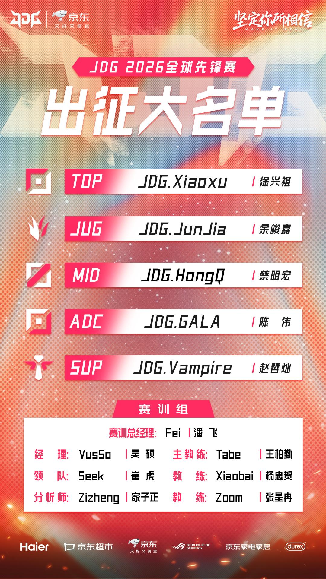 虎扑03月13日讯今日JDG发布26先锋赛出征大名单,具体如下: