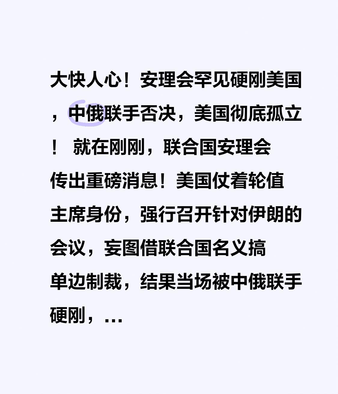 大快人心!安理会罕见硬刚美国,中俄联手否决,美国彻底孤立! 就在刚刚,联合国安理会传出重磅消息!美国仗着轮值主席身份,强行召开针对伊朗的会议,妄图借联合国名义搞单边制裁,结果当场被中俄联手硬刚,直接投下反对票,狠狠打脸美国霸权! 美国这次操作太霸道了!明明伊核相关制裁早已暂停,它却无视规则,强行把过期议题搬上安理会,还倒打一耙,指责中俄“保护伊朗”,完全是颠倒黑白、蛮不讲理。 更离谱的是,美国多次在安理会滥用否决权,加沙停火决议14国赞成,唯独美国一票否决;涉中东和平草案,它百般阻挠;就连人道主义救援,它都要从中作梗,完全把安理会当成自家后花园,只顾自己利益,不顾全球安危 。 谁也没想到,这次美国踢到铁板!中国常驻联合国代表傅聪当场强硬驳斥,直言美国是伊核危机始作俑者,谴责美以军事行动违反国际法,要求立即停手;俄罗斯也坚定站队,两国联手否决,不给美国任何搞霸权的机会。 要知道,安理会是维护世界和平的地方,不是美国横行霸道的舞台!美国总想着搞双重标准,对别国指手画脚,自己却肆意发动战争、制造冲突,早已失道寡助。 这次中俄联手硬刚,不是针对谁,而是守护公平正义,守护国际法底线!越来越多国家看清美国真面目,不再任由它摆布,美国的霸权时代,真的要落幕了! 公道自在人心,霸权终会崩塌!为中国立场点赞,为正义发声,愿世界再无霸权,和平永驻!