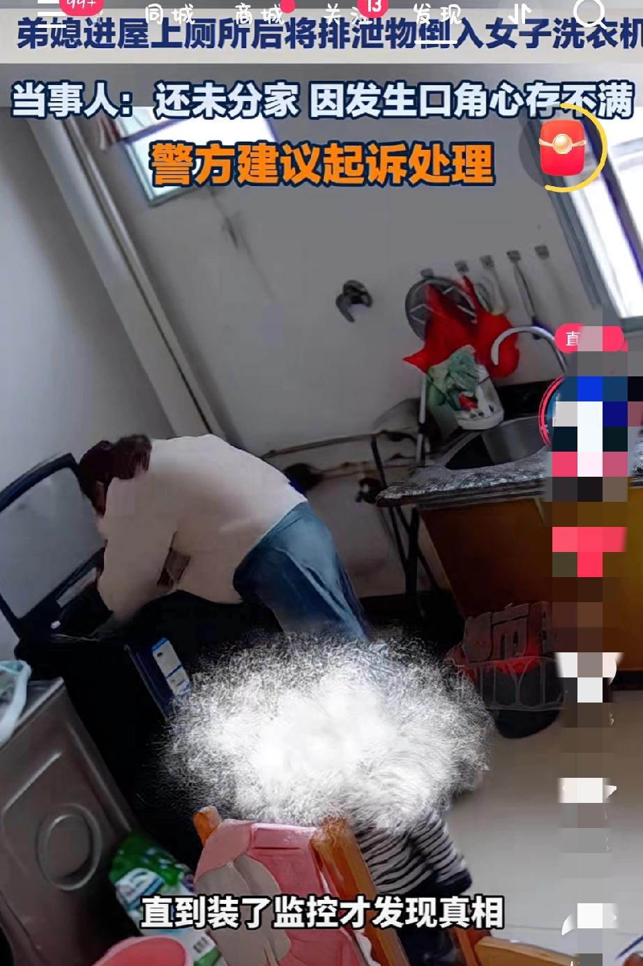 太恶心了!弟媳在厨房用烧水壶小便后还把尿倒入嫂子的洗衣机里!女子称每次洗完衣服都有尿骚味,警方建议起诉处理 近日,广西南宁发生一起家庭纠纷,弟媳因与嫂子发生口角心存不满,竟趁家中无人,将排泄物倒入嫂子的洗衣机,恶劣行径被监控拍下后,也引起了网友的热议。 事件当事人谭女士表示,自家与弟弟家还没有分家,他们一直住在一起共同生活。从去年开始,她每次洗完衣服,总能闻到一股刺鼻的尿骚味,起初以为是洗衣机长期未清洁滋生细菌,便多次对洗衣机进行深度清洗,可异味始终无法消除,这让她困惑不已,心中也一直留有疙瘩。为了查明真相,谭女士在家中安装了监控,而监控画面记录下的一幕,让她既愤怒又崩溃。 3月10日,谭女士调取监控发现,事发当天家中无人,弟媳鬼鬼祟祟地溜进她的厨房,先是东张西望确认周边无人,随后拿起灶台上的烧水壶,蹲在洗衣机旁的角落小便,接着径直打开洗衣机盖子,将装满尿液的烧水壶悉数倒入。更令人唏嘘的是,弟媳的孩子目睹了整个过程,却毫无异样反应,可见这种恶劣行为并非首次,已然持续了很长时间。 事发后,谭女士选择报警处理。警方对弟媳进行了严肃教育,并建议谭女士通过法律途径起诉,维护自身合法权益。 监控曝光后,网友们直呼“太坏了,孩子还在旁边,言传身教这会把孩子带坏的”,“太恶心了,烧水壶里小便,还不止一次,以后喝水都有心理阴影了”,“当面干不过,背后来阴招”…… 看到这个视频,真的是让人忍不住吐槽太没素质了,而且还太恶心了。即便是妯娌之间关系再不好,也是一家人,有什么矛盾摊开来,掰碎了说清楚,如果真的是解决不了,也可以老死不相往来,哪能做出这么龌龊的事情,尤其还是当着自己孩子的面。对于孩子的成长,我们家长首先就要树立一个好榜样,因为父母是孩子的第一任老师,他们的行为严重影响了孩子三观的正确形成。对此你怎么看?