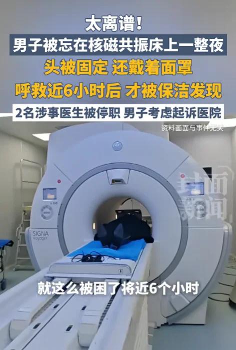 怪事无处不在。 武汉。唐先生被两名医生忘在核磁共振床上6个小时,直着脖子喊也没人应声,早晨6点被保洁员发现才被救。涉事医生被停职,医院向唐先生道歉,赔偿金额没谈拢,医院建议唐先生起诉。 医院称,核磁共振对身体无影响。无影响,弄一个厚厚的大门?门外让人群远离?建议患者起诉,这是觉得自己一定能赢,不怕呗? 唐先生就不能白天去?半夜,你不困,医生困了,如果有下一个做检查的,就把你解救下来了。医生只是把你的头固定了,手脚都是自由的,为啥不自己下来?以后去医院,必须家人陪同,这样才有安全系数。