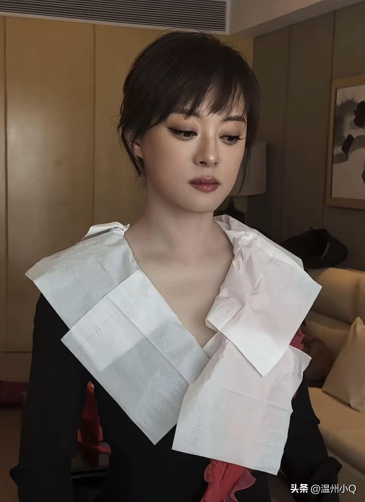 没点开大图前,还以为孙俪穿了一件白色荷叶领的衣服,其实是围了一圈纸巾,怕做妆发弄