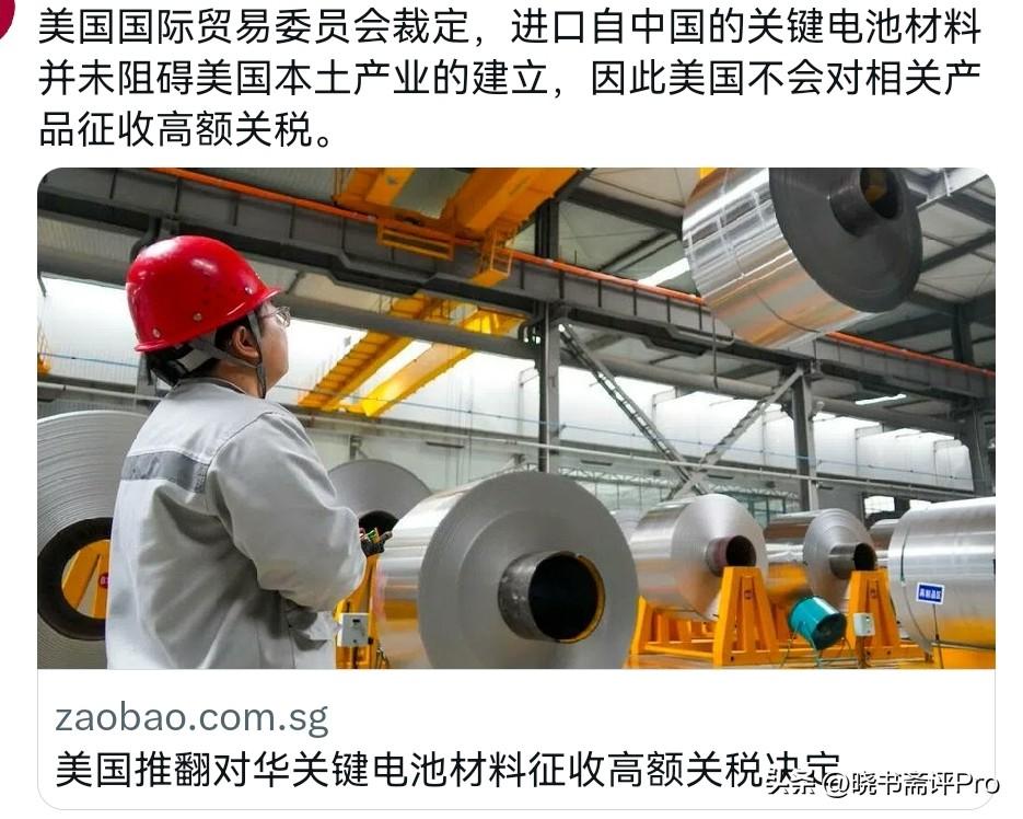 罕见,美国主动对我们释放善意了!3月13日,根据新加坡联合早报报道,美国国际贸易委员会裁定,进口自中国的关键电池材料并未阻碍美国本土产业的建立,因此美国不会对相关产品征收高额关税。很显然,美国的这一宣布,时间点非常的微妙。其一,这是中美即将进行经贸谈判之前。其二,这也是美国单方面宣布的特朗普将要访华的行程之前。 事实上,此前商务部执意要加征高额关税,而此番美国又推翻之前的裁定,美国明显是有意松绑电池材料关税,给双边对话提前铺路、释放缓和信号,避免在核心议题上还没谈之前,就先把气氛给搞僵了。不过,美国找的理由,还是让人有点惊讶。美国方面声称的“进口自中国的关键电池材料并未阻碍美国本土产业的建立”。 在美国本土电池材料产能严重不足,近七成依赖中国供应的情况下,美国方面还要建立独立自主的电池材料产业,这能否成功,这就见仁见智了。无疑,美国方面的这一举动充分说明,美国根本不可能完全跟我们脱钩断链。这也说明,美国对华策略正在从“全面遏制”转向选择性对抗、选择性合作,也就是卡脖子的领域寸步不让,刚需领域则灵活松绑。不是我们释放和缓信号,而是由美国主动释放和缓信号,这也证明中美博弈的大局,正在发生微妙的变化。