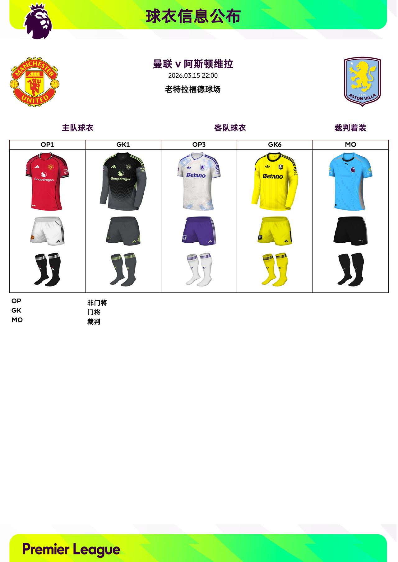 2025/26赛季英超联赛第30轮球衣信息: ◉ 焦点战——曼联 v 阿斯顿维