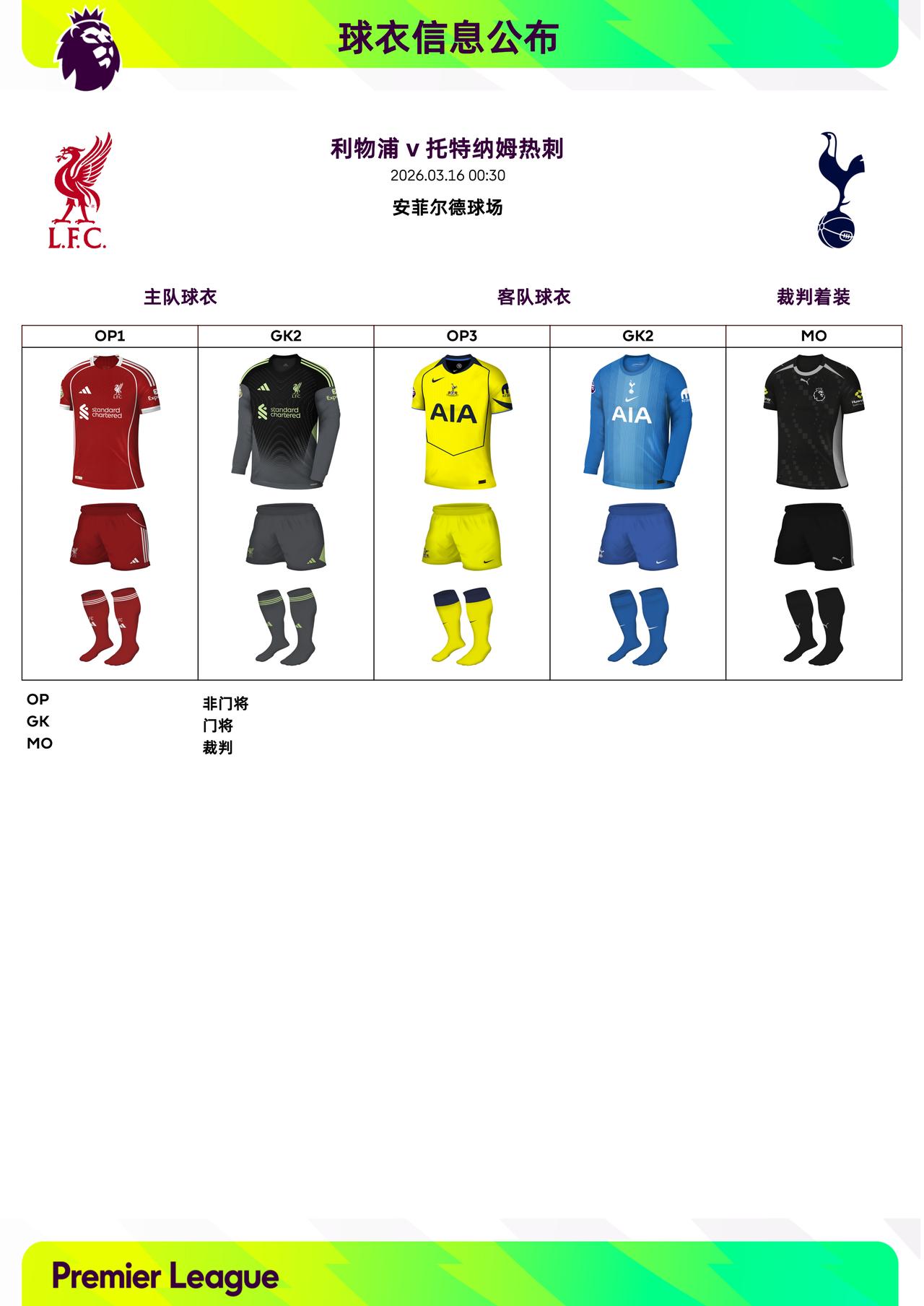 2025/26赛季英超联赛第30轮球衣信息: ◉ 焦点战——曼联 v 阿斯顿维拉,维拉身穿浅色第二客场球衣 利物浦 v 托特纳姆热刺,热刺身穿黄色第二客场球衣