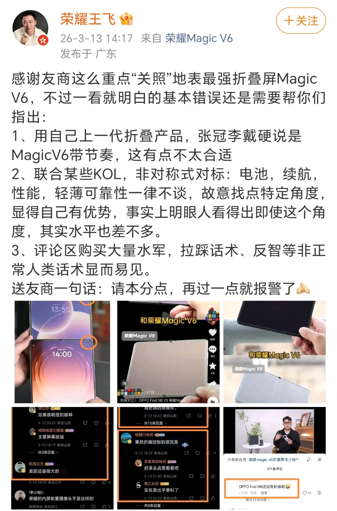 真的要被友商的操作笑到,有本事光明正大对标产品,没本事就别搞这些上不了台面的阴招!荣耀Magic V6“地表最强折叠屏”的名头,是靠7150mAh大电池、旗舰性能、极致轻薄这些硬实力打出来的,不是靠吹的。你倒好,拿自家上一代产品张冠李戴栽赃,核心参数全不敢碰,只会找犄角旮旯的角度尬黑,还买水军刷反智话术。之前造谣Magic8的已经被处理到公开道歉,这次人家直接放话再过分就报警,别到时候又哭着道歉,丢不丢人?荣耀产品经理喊话友商请本分
