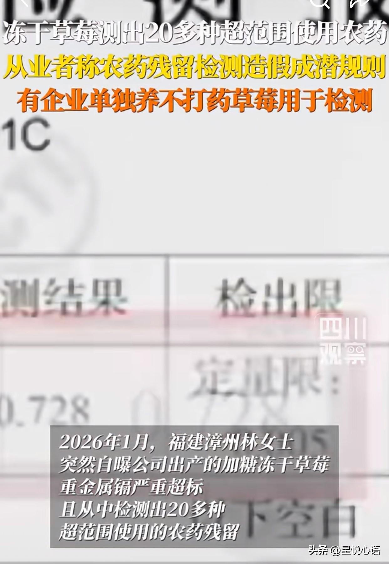 315曝光冻干草莓的事,真的越看越气! 镉超标14倍,还有20多种农残,甚至有禁用的高毒农药,这哪是健康零食,简直是“毒零食”! 给娃囤过的家长,想想都后背发凉。 更离谱的是检测造假! 花钱就能买合格报告,还专门养不打药的草莓送检,纯纯糊弄消费者。 评论区说蓝莓也搞科技,放半个月都不蔫,现在吃点放心的果干咋就这么难? 食品安全的底线不能塌啊! 希望监管部门严查到底,把这些歪门邪道全打掉。咱老百姓吃点东西,就想图个安心,别再让大家提心吊胆了!