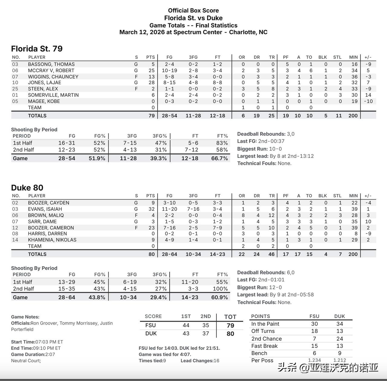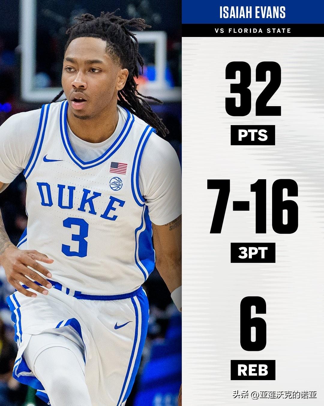 杜克大学险胜佛罗里达州立,蓝魔关键时刻仍然信任布泽尔,但他投篮直接被封盖,可惜对手致胜球投失,未能完成爆冷,新人前锋Cameron Boozer单场23分10篮板,荣获Sporting News评选的全美最佳球员,Cayden Boozer赛后称赞Isaiah Evans的32分生涯之夜,他今天把我们扛在肩上。