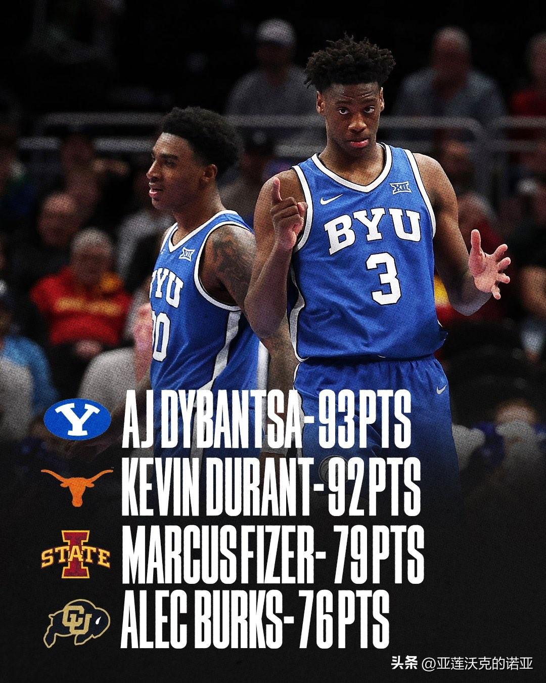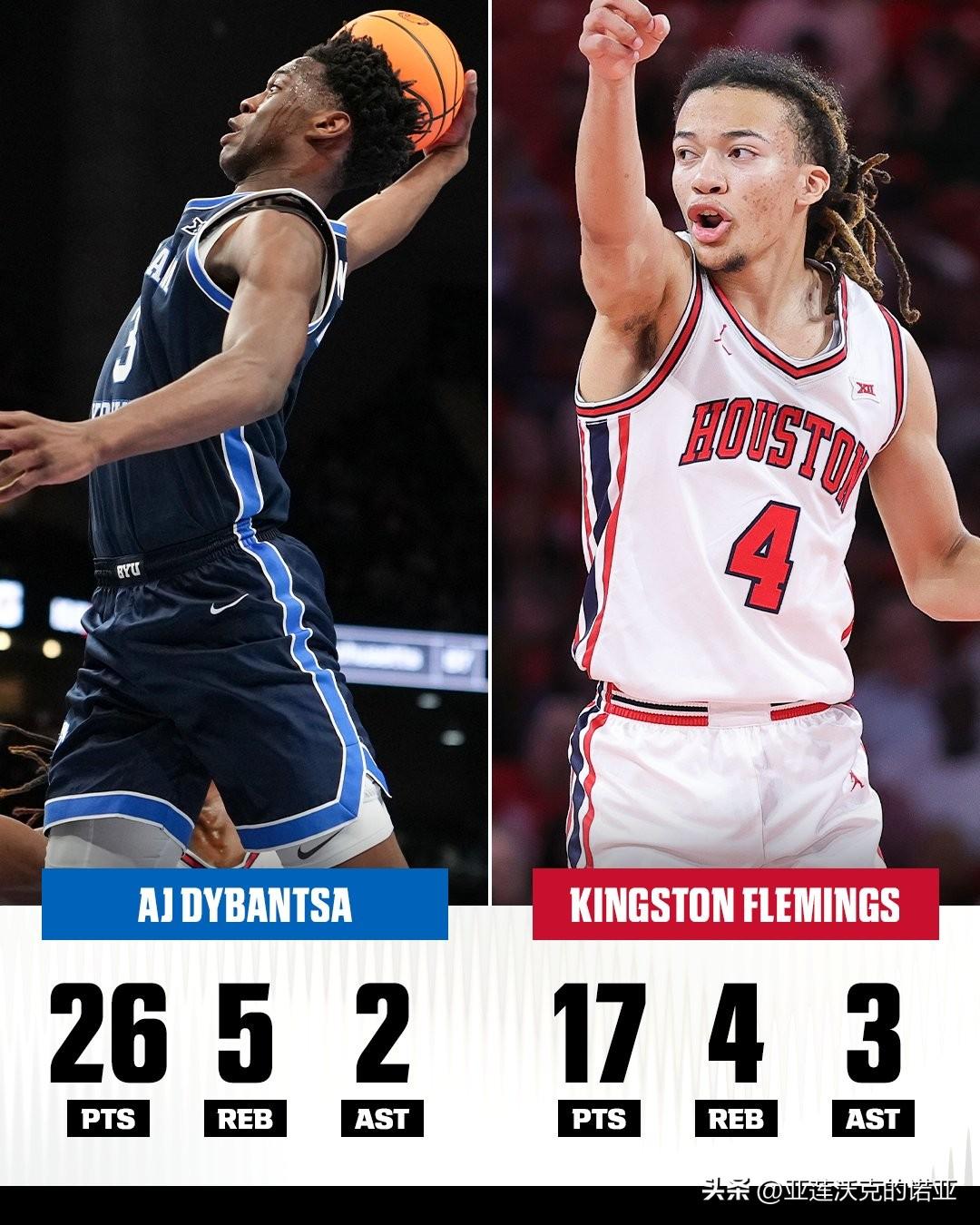 杨百翰AJ Dybantsa 26分5篮板 vs 休斯顿Kingston Flemings 17分4篮板3助攻,迪班萨三场比赛得到93分打破Big 12联盟锦标赛单届得分记录,之前是杜兰特的92分,赛后谈无缘再战Darryn Peterson时表示遗憾,本盼取胜后与堪萨斯重逢,此前在对方主场输球,期待再次与彼得森交手时赢下比赛。