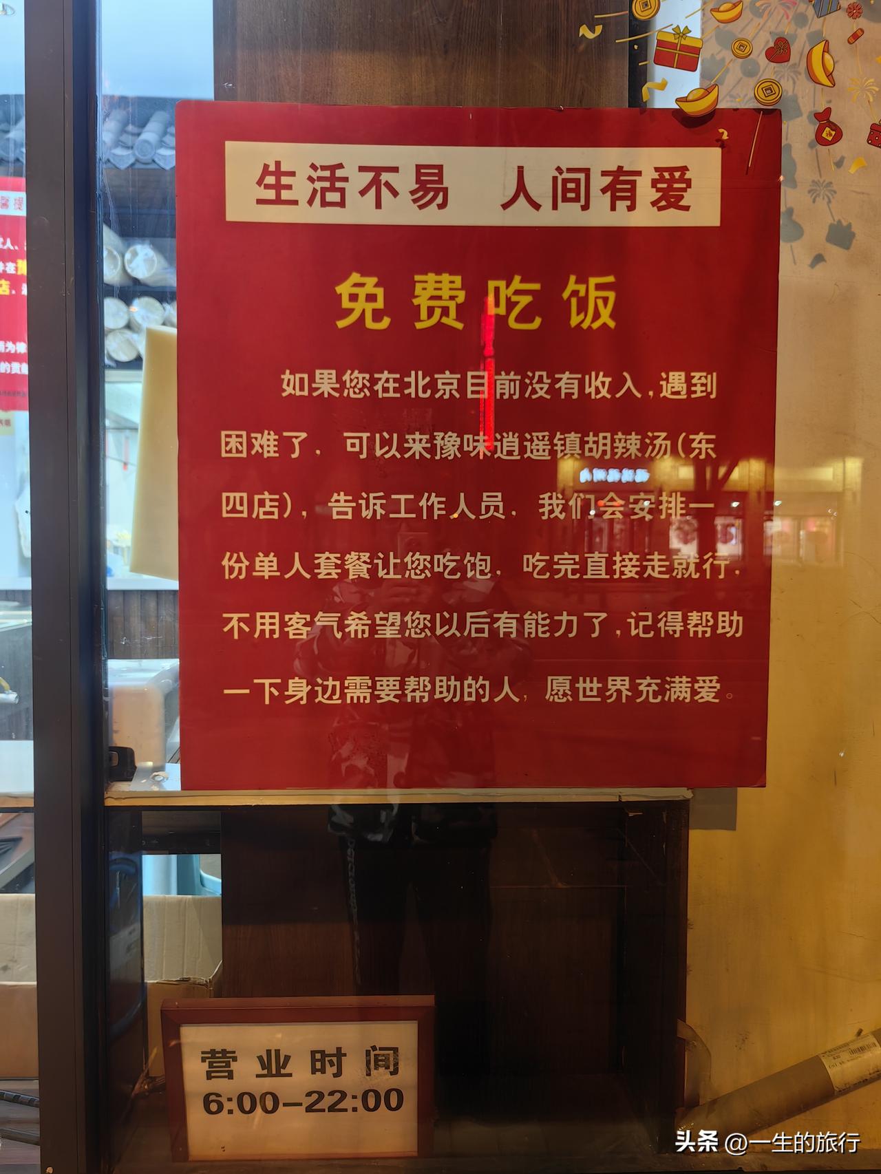 天下真有免费的午餐!这家店贴出来的告示,让人看了泪目。居京城大不易,特别是近两年,身边失业、降薪的朋友不少。如果真的到了一顿饭都困难的地步,这家小店可以解一顿之饥。 小店在东城区东四附近,就是北新桥地铁口往南几百米,离美食遍布的簋街不远。看它的菜单,价格也都是比较亲民的,能保本经营就不错了。所售的胡辣汤等是河南风味,应该是河南人所开吧。这让我不禁感慨,河南人总是如此胸襟宽广,从胖东来对员工分几十亿、40天年假等各种好,到这家小店对陌生人的温暖,河南人在经商方面的真诚质朴,让旁人听了看了都被感动。 我还吃得上饭,我要花钱去吃一顿。