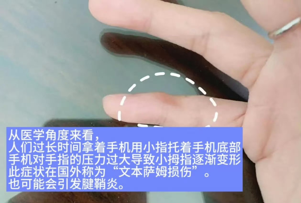 前阵,在西安接待一大哥,看到他都用触控笔来点屏幕了,问了下,他已经是严重腱鞘炎患者。短视频时代,手机带给人们便捷同时,也容易让人成瘾,导致各种健康隐患,真的需要警惕。长期用小拇指托手机的后果