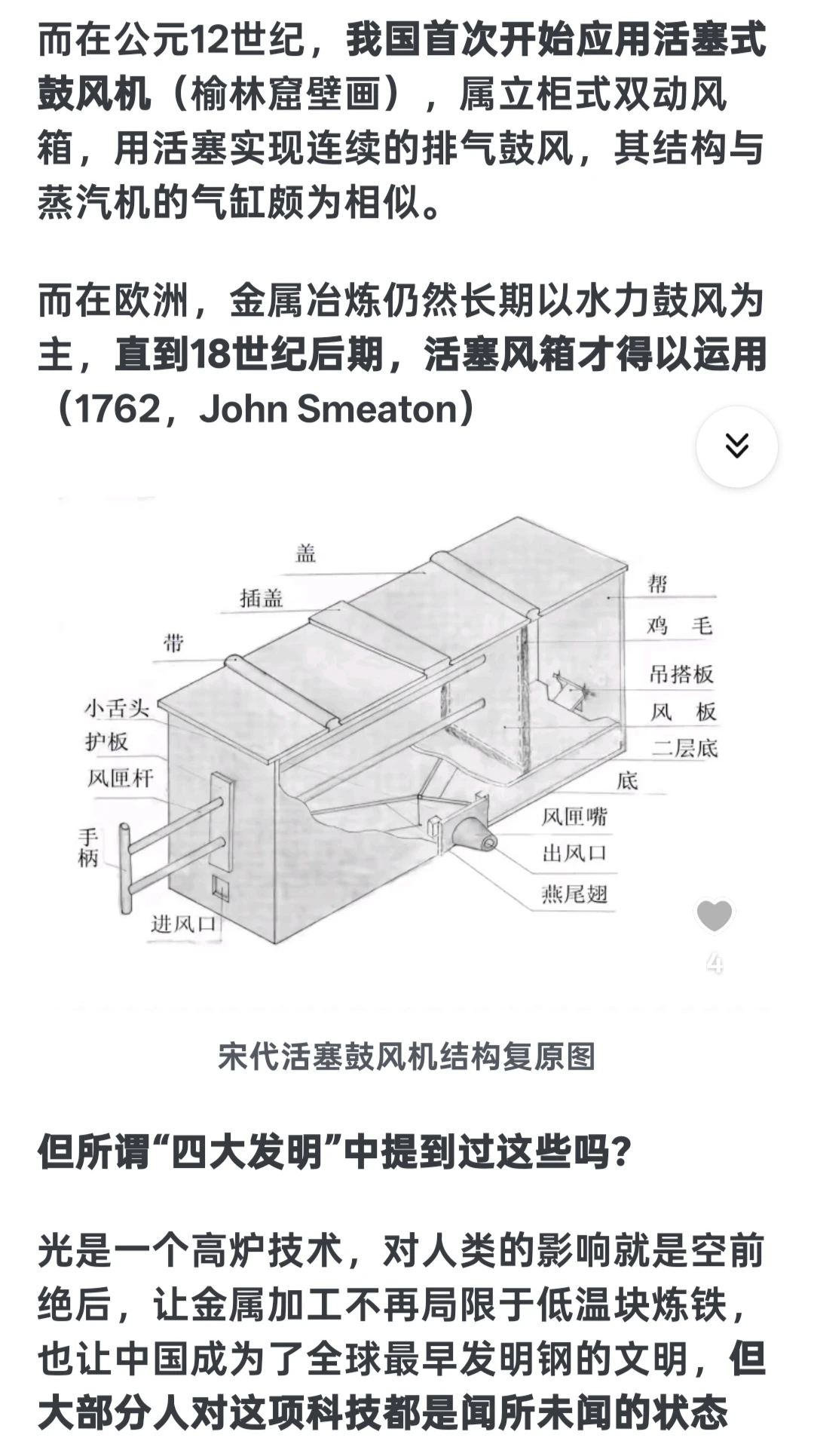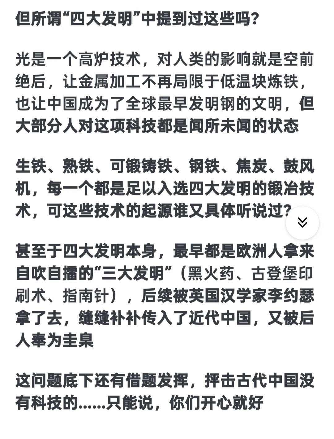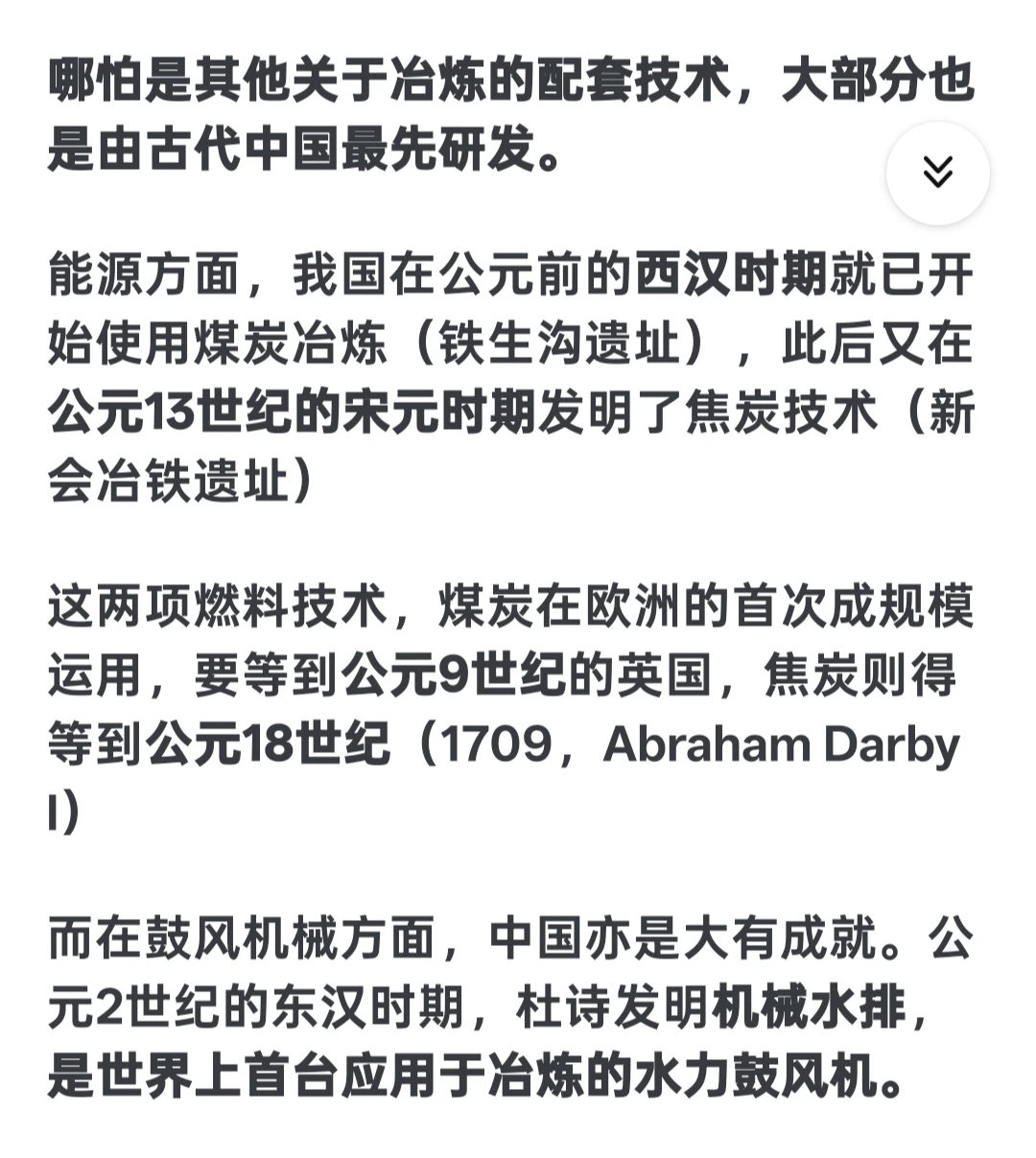 我是小乌鸦 1 2026-03-14 08:41 因为是故意的啊,把你的科学技术只限制在四大发明以内。让你在舆论场上落入没有中国古代没有体系科技的舆论陷进。学天文必定诞生数学,所以周朝开始古代就有系统的数学著作了(周髀算经),炼铁必定带来采矿,冶炼等一系列的技术总结与进步。发达的铸造一定带来精细化标准化的金属器具(秦朝就有手钳了,活页了),医疗,地理,物理现象等。不过清朝一把过烧完了,而且因为清朝因为没有清算,你的所有想复兴或者称赞中华文明强大的言论,都是对清朝的鞭打贬低(因为它是毁灭者),所以你越想文化复兴越想说明古代文明,洗清朝的言论就越多。