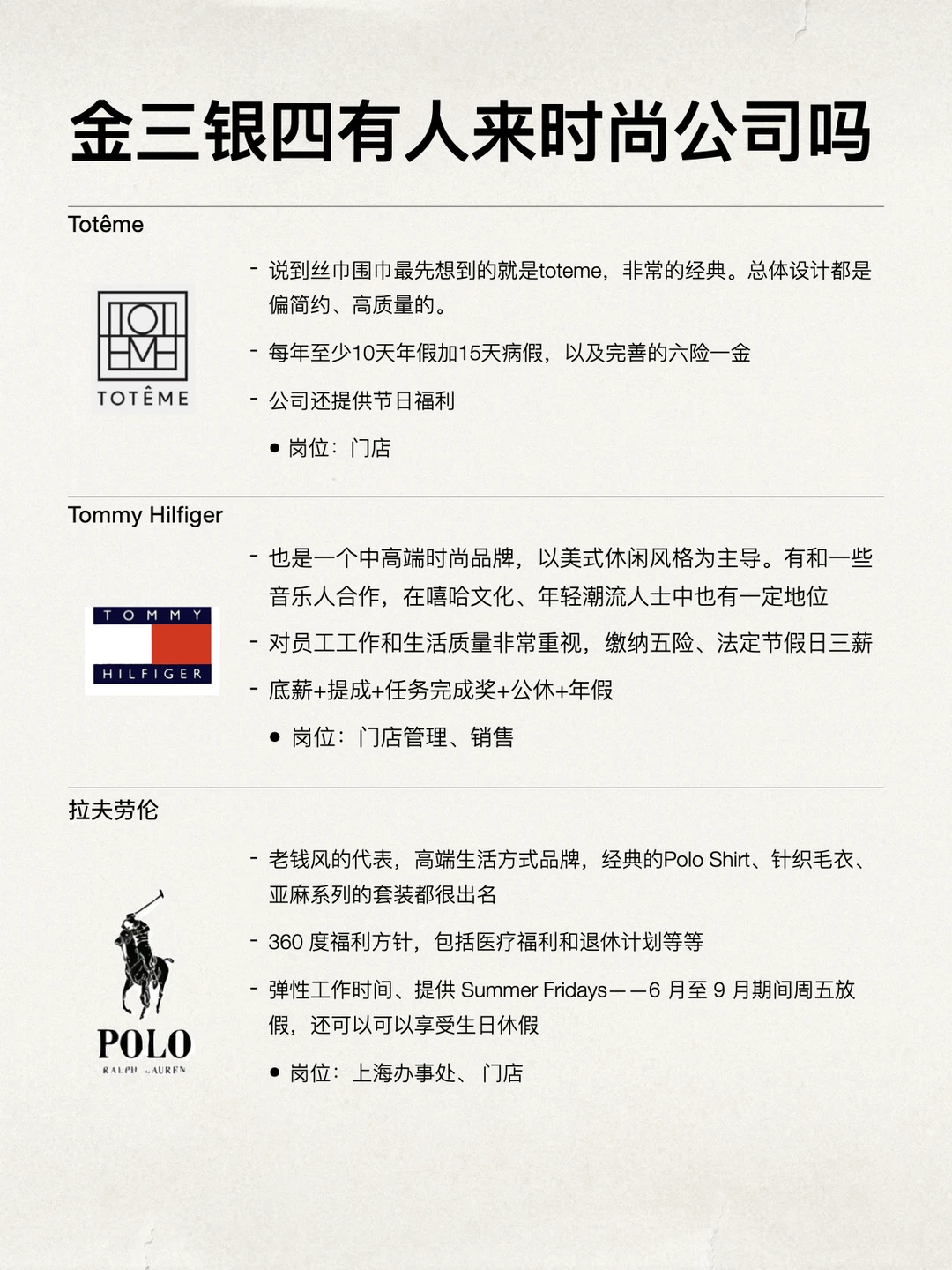时尚外企其实挺有氛围感的。日常接触的就是品牌、穿搭、视觉内容这些东西,本身就很生活化,很多团队也比较年轻,沟通方式会比传统行业轻松很多 福利一般也都挺不错。基本都是 955、双休,年假 10–15 天起,有些公司还会有员工内购、品牌折扣、节日礼物这些 很多时尚外企也挺重视工作体验,比如弹性办公、团队活动、品牌福利都比较丰富。如果本身就喜欢穿搭、审美类内容,这类公司待着其实挺有意思的 坚持日更✊🏻,对外企感兴趣的欢迎常来看看