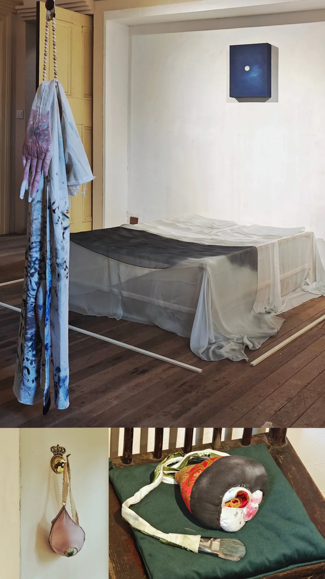 《洗洗睡吧》:长时间曝光摄影,将睡眠的身体消融于环境,被记录者的一夜睡眠状态在此一览无余。摄影作品和林安琪的丝绸床装置形成对话,安置在老洋房卧室的作品,更让空间回归原始功能,实现作品和场域的深度共生。