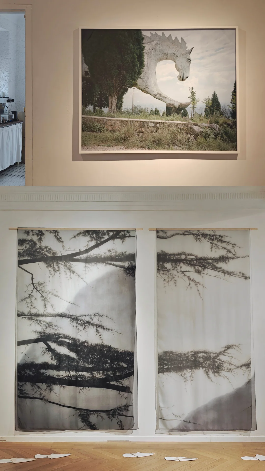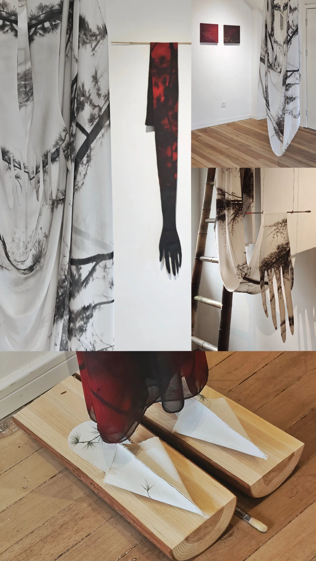 手、身体部位、鬼影般的意象反复出现,营造出缺席与在场的微妙张力;半透明丝绸构建的“门槛”装置,结合瑞士卢加诺湖畔的自然观察,将雪松景观转化成幕帘和悬浮形象,消解了空间的内外边界,在自然与人文的交融中,反思时间与本心。