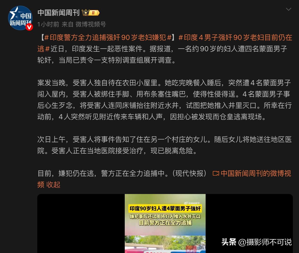 印度四蒙面男子居然侵犯90岁老太太,这口味是不是有点太过抽象了?事发当晚,该90岁老太太独自在家,吃完饭后就去睡觉了。谁知忽然闯进4名蒙面壮汉,将老太太五花大绑堵住嘴巴后实施罪恶。事后,这四名男子恶向胆边生,打算杀人灭口。不过方式很抽象,他们把床和人一起抬到水井边,准备将老太太投井淹死,结果被路过的车和人惊吓后落荒而逃。印度就是印度,几乎隔三差五就会发生类似恶性事件,这种狗血事件如果不从根本上去解决去、不用重典,估计将会越来越多!