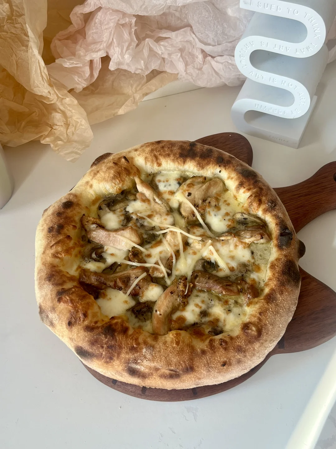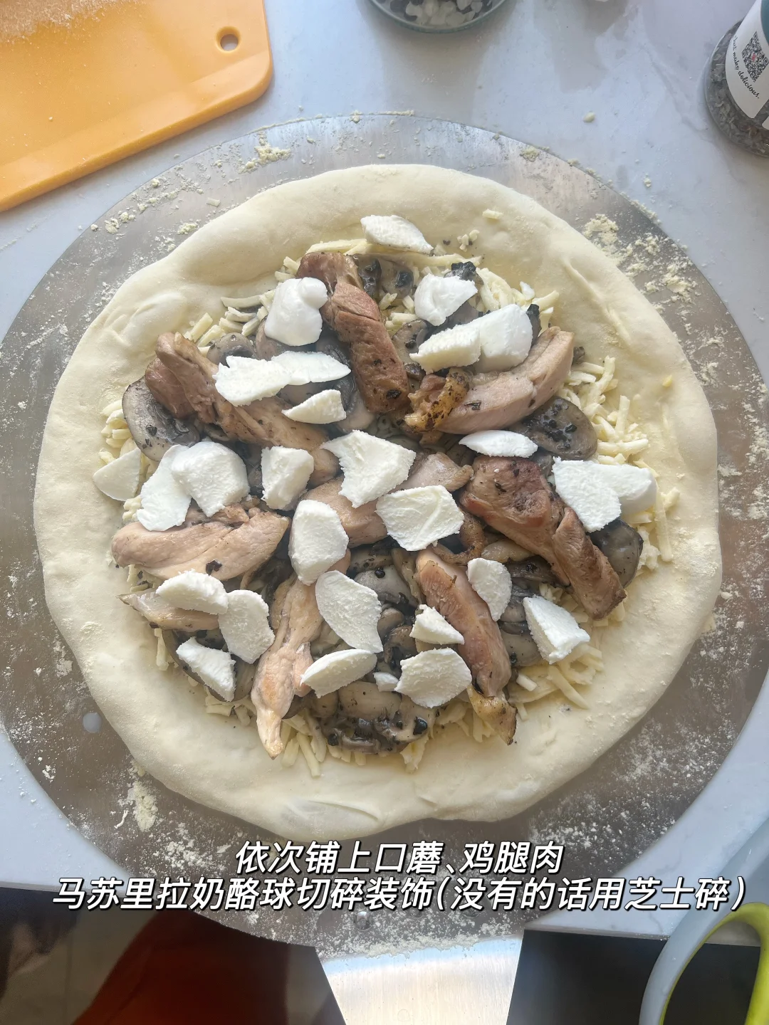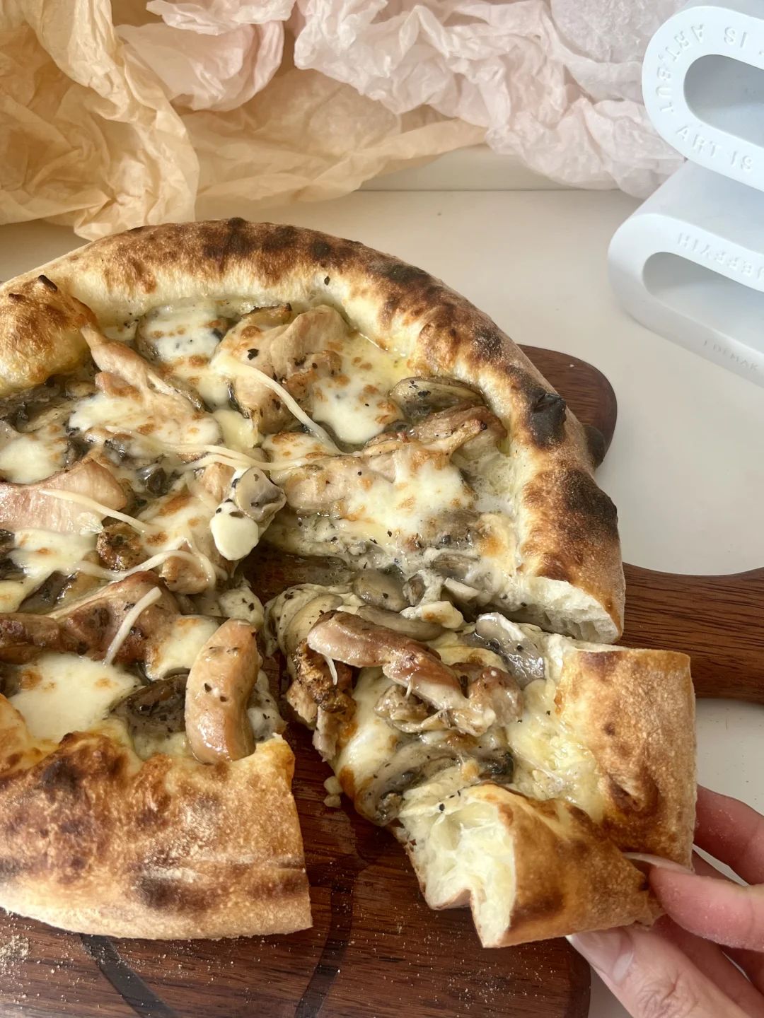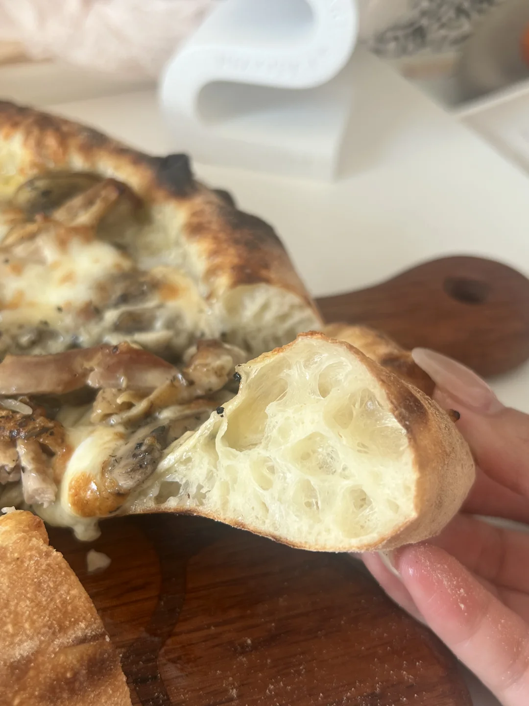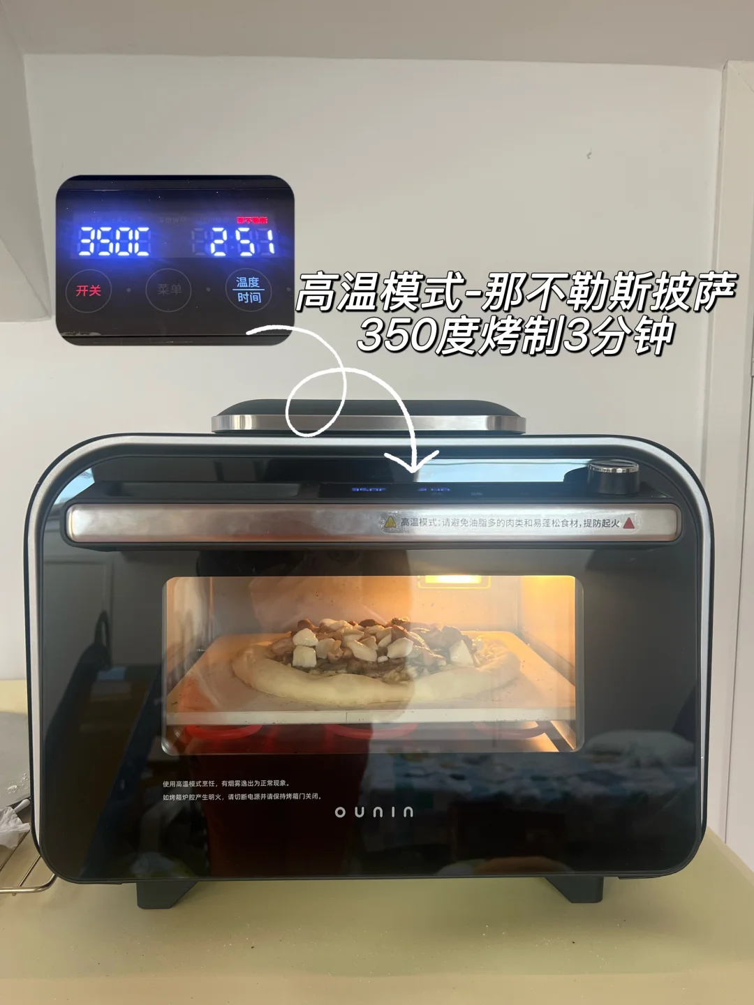 爱吃披萨的姐妹们求求你们了!快去试! 奶香加上特殊的蘑菇香,好吃到我要把舌头吞了! 隔夜发酵披萨永远的神~[喝奶茶R] —— ✅面团 高筋粉150g、清水115g、盐3g、干酵母2g、橄榄油10g 馅料:口蘑5-6个、半个鸡腿肉、黑松露酱(适量)、淡奶油(适量)、马苏里拉芝士 ▫️烘烤温度:350度 3分钟 欧宁披萨炉依旧发挥稳定,不愧是专业的,大风炉上色超漂亮!